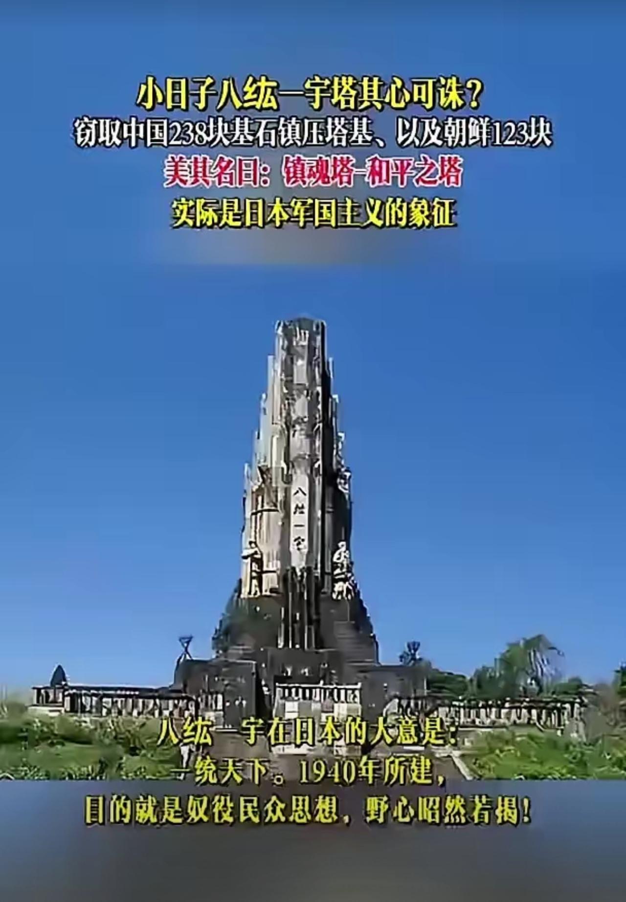 家人们,今天必须聊聊日本那座沾满中国血泪的“八纮一宇塔”!这哪是什么塔啊,分明是用侵略罪证垒起来的耻辱柱! 1940年建成的这破塔,36.7米高的身子里藏着满肚子坏水——塔基370多块石头全是从被占领国抢来的,光中国就占了238块!南京明故宫的麒麟石、中山陵的石墙、万里长城的墙砖,连泰山、庐山的奇石都没能幸免,每一块石头上都刻着“强盗”俩字! 最让人剜心的是那块南京麒麟石!上面还留着“南京日本居留民会”的刻字,是南京大屠杀刚过一年多就被抢走的!咱中国的瑞兽麒麟,脑袋都被砸得稀碎,硬生生成了日军的“战利品”,这底下压着的是30多万南京同胞的冤魂啊! 更可气的是,日本军国主义当年喊着“八纮一宇”(说白了就是想称霸世界)建这塔,战后盟军让拆,他们就涂掉标语换个“和平之塔”的马甲继续招摇,这自欺欺人的戏码也太拙劣了!南京民间抗战博物馆的吴先斌馆长2015年带着人去讨石,日方却揣着明白装糊涂,连句痛快话都不敢说,还把这塔的“光辉历史”塞进中学试题,压根不提掠夺的事——这是想把谎言喂给下一代啊! 要知道,二战时日本从中国抢了上百万件文物,东京国立博物馆里一万多件中国文物,半数来源不明,说白了就是赃物!德国都在主动还,就日本揣着赃物装无辜? 现在咱就一句话:这塔必须拆!石头必须还!不是咱较真,是历史容不得糊弄,罪证盖不住!真要谈和平,就得先把欠的血债还明白!家人们,你们说这理儿对不对?😠