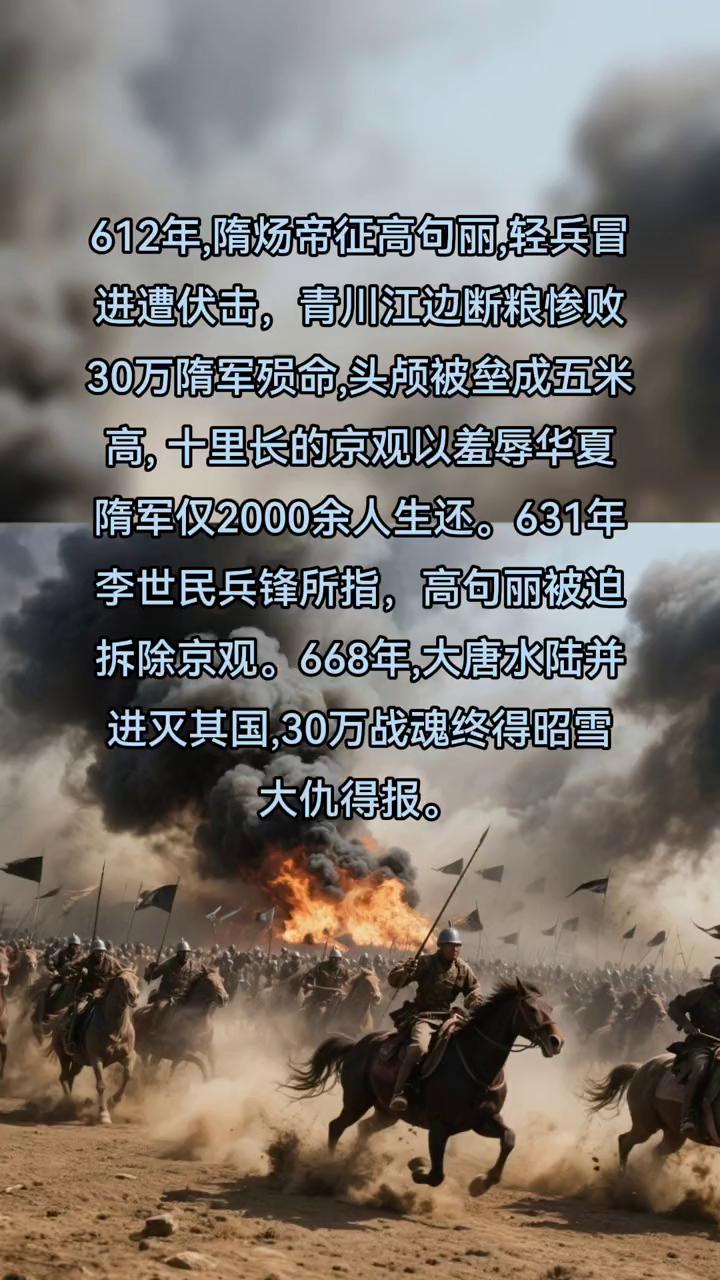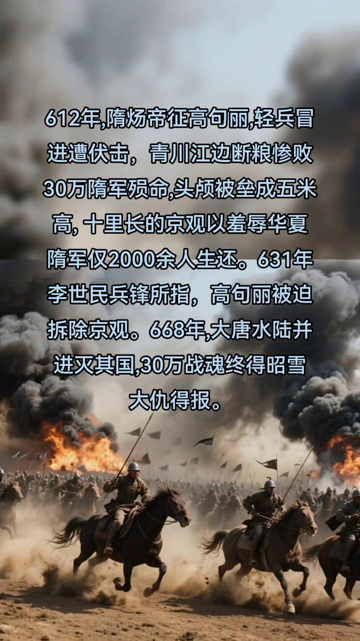 612年,隋炀帝征高句丽,轻兵冒进遭伏击,青川江边断粮惨败,30万隋军殒命,头颅被垒成五米高,十里长的京观以羞辱华夏,隋军仅2000余人生还。631年,李世民兵锋所指,高句丽被迫拆除京观。668年,大唐水陆并进灭其国,30万战魂终得昭雪,大仇得报。