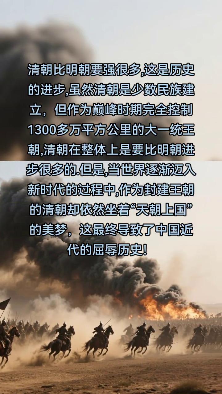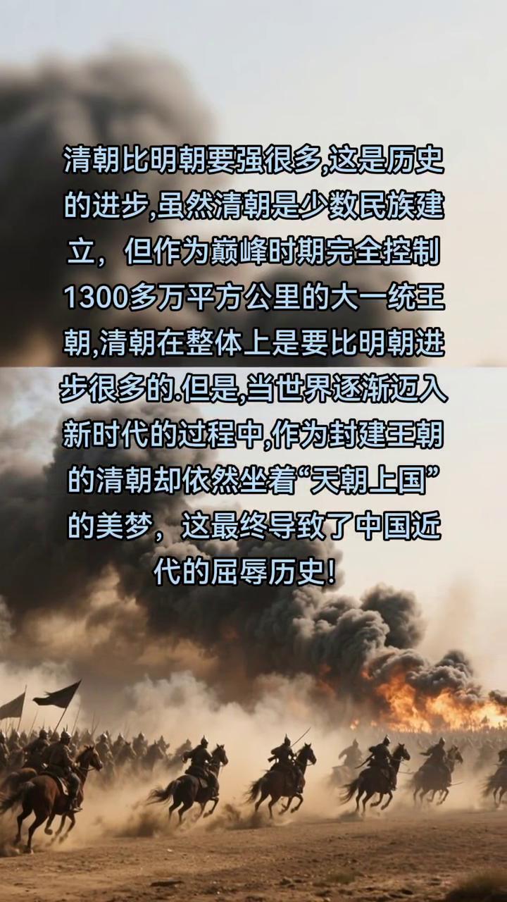 清朝比明朝要强很多,这是历史的进步。虽然清朝是少数民族建立,但作为巅峰时期完全控制1300多万平方公里的大一统王朝,清朝在整体上是要比明朝进步很多的。但是当世界逐渐迈入新时代的过程中,作为封建王朝的清朝却依然做着"天朝上国"的美梦,这最终导致了中国近代的屈辱历史!