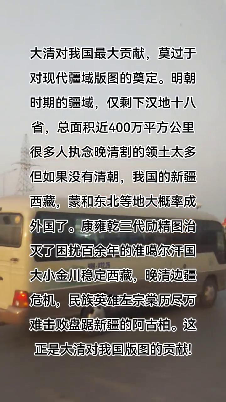 大清对我国最大贡献莫过于对现代疆域版图的奠定。明朝时期的疆域仅剩下汉地十八省,总面积近400万平方公里。很多人执念晚清割的领土太多,但如果没有清朝,我国的新疆、西藏、蒙和东北等地大概率成外国了。 康雍干三代励精图治,灭了困扰百余年的准噶尔汗国,大小金川稳定西藏,晚清边疆危机,民族英雄左宗棠历尽万难击败盘踞新疆的阿古柏。这正是大清对我国版图的贡献!