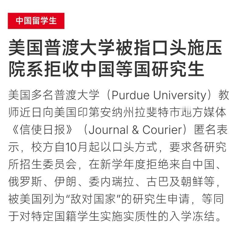 美国普渡大学决定拒招中国留学生,做出这项决定的是该校校长蒋濛。蒋濛出生于天津,在香港长大,后移民美国,2023年出任普渡大学第13任校长。 长着一副华人脸,只能通过这种恶劣行为,向美国表决心,否则担心美国看不上。 他为什么不开除自己?!忘记祖宗、背离祖宗、是可耻可恶的!自己的祖宗都不爱,你会爱别的祖宗?无非是自己的利益罢了,别国也不傻啊,终究是会被遗弃的! 不过,任何事物总有正反两面,蒋濛当校长的美国普度大学拒召中国留学生,未尝不是好事,干嘛要为美国霸权培养打工人啊!