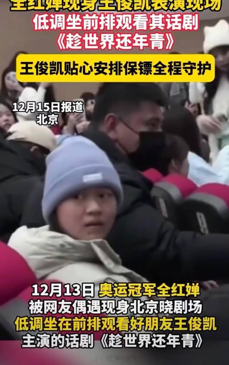 :跨圈友谊里的暖心细节2025年12月,北京晓剧场因一场特殊的观演画面引发全网热议——奥运跳水冠军全红婵低调现身观看王俊凯主演的话剧《趁世界还年青》,身旁全程有王俊凯的贴身保镖陪同照料,从验票入场、挡避闪光灯到散场开路,每一个细节都藏着跨越领域的真挚关怀,让话题迅速突破两亿阅读量。这并非简单的排场加持,而是一段双向奔赴的跨圈友谊最动人的注脚。此次保镖陪同的背后,是王俊凯对好友的细致考量。当时王俊凯主演的话剧正处于北京连演的关键阶段,4848张门票5秒售罄,剧场内星光汇聚、观众热情高涨,难免出现围观拍照、人流拥挤的情况。王俊凯深知全红婵作为公众人物,既需要安静的观演环境,也需避免不必要的人群骚动,于是特意指派跟随自己多年的保镖全程守护。现场视频中,全红婵身穿白色羽绒服、头戴蓝色针织帽,安静坐在观众席专注观演,保镖则默默守在侧旁,在有观众举起手机拍照时巧妙挡避闪光灯,既不打扰他人,也为全红婵营造了安稳的观演氛围,这份妥帖让网友直呼“细节见真心”。