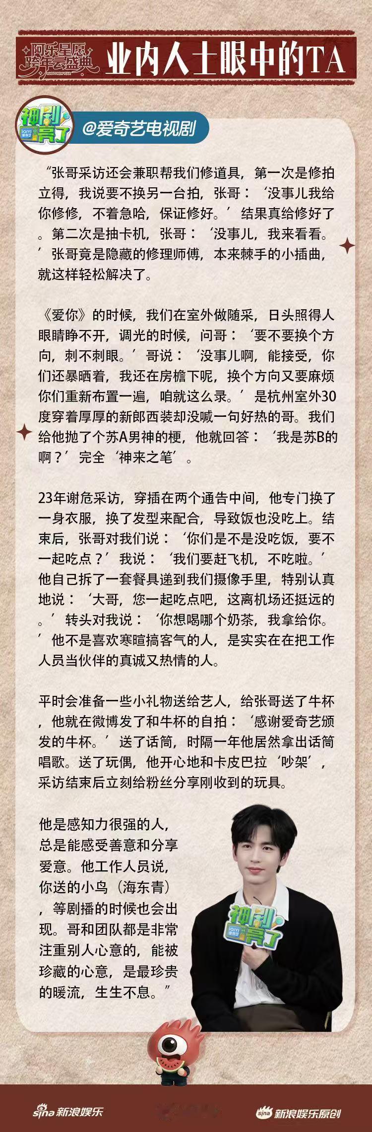 张凌赫会帮工作人员修道具张凌赫 你们还暴晒着呢 采访还会兼职帮记者修道具,第一次是修拍立得,记者说要不换另一台拍,张哥:“没事儿我给你修修,不着急哈,保证修好。”结果真给修好了。第二次是抽卡机,张哥:“没事儿,我来看看。”最后也修好了~张哥竟是隐藏的修理师傅!