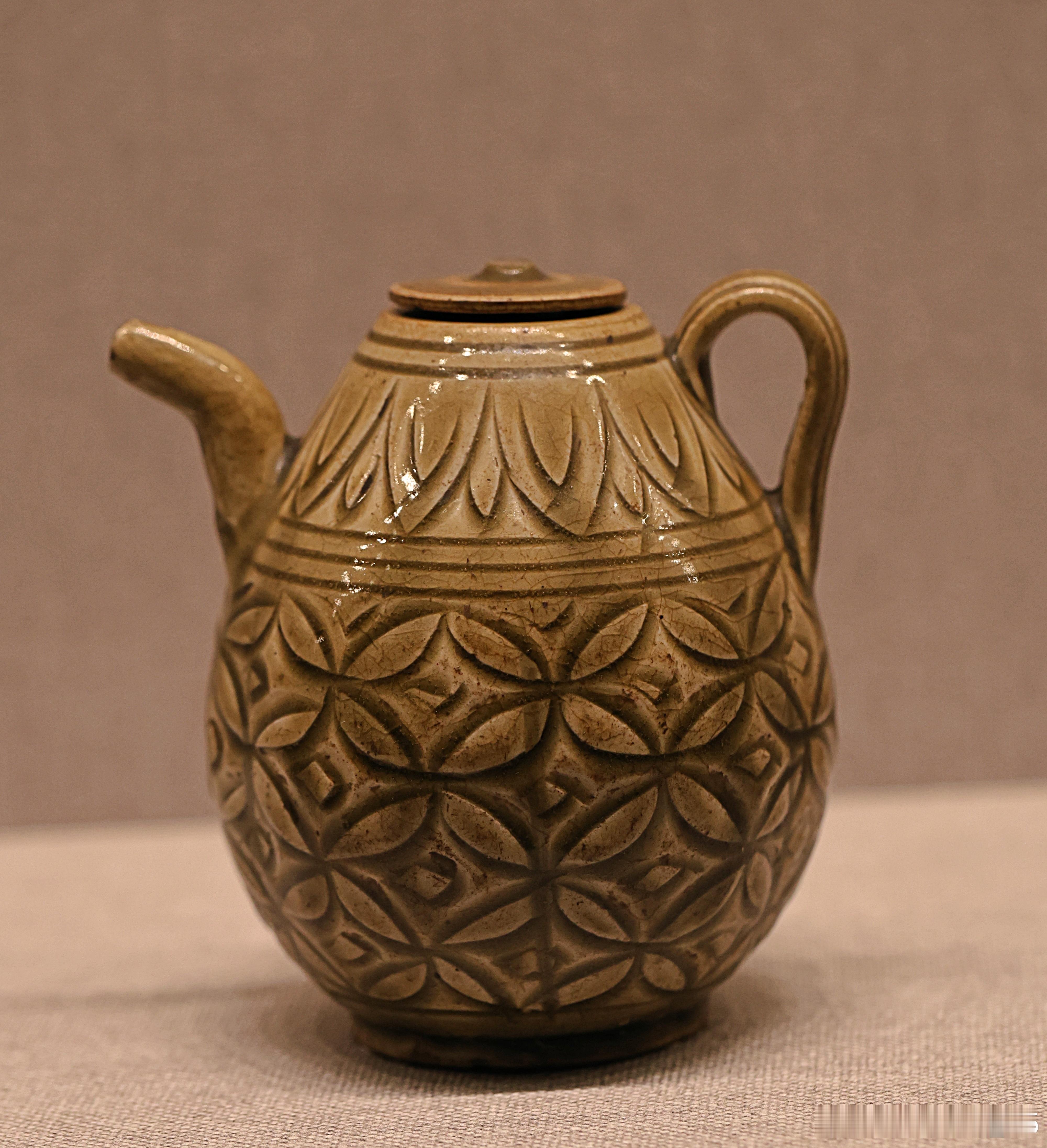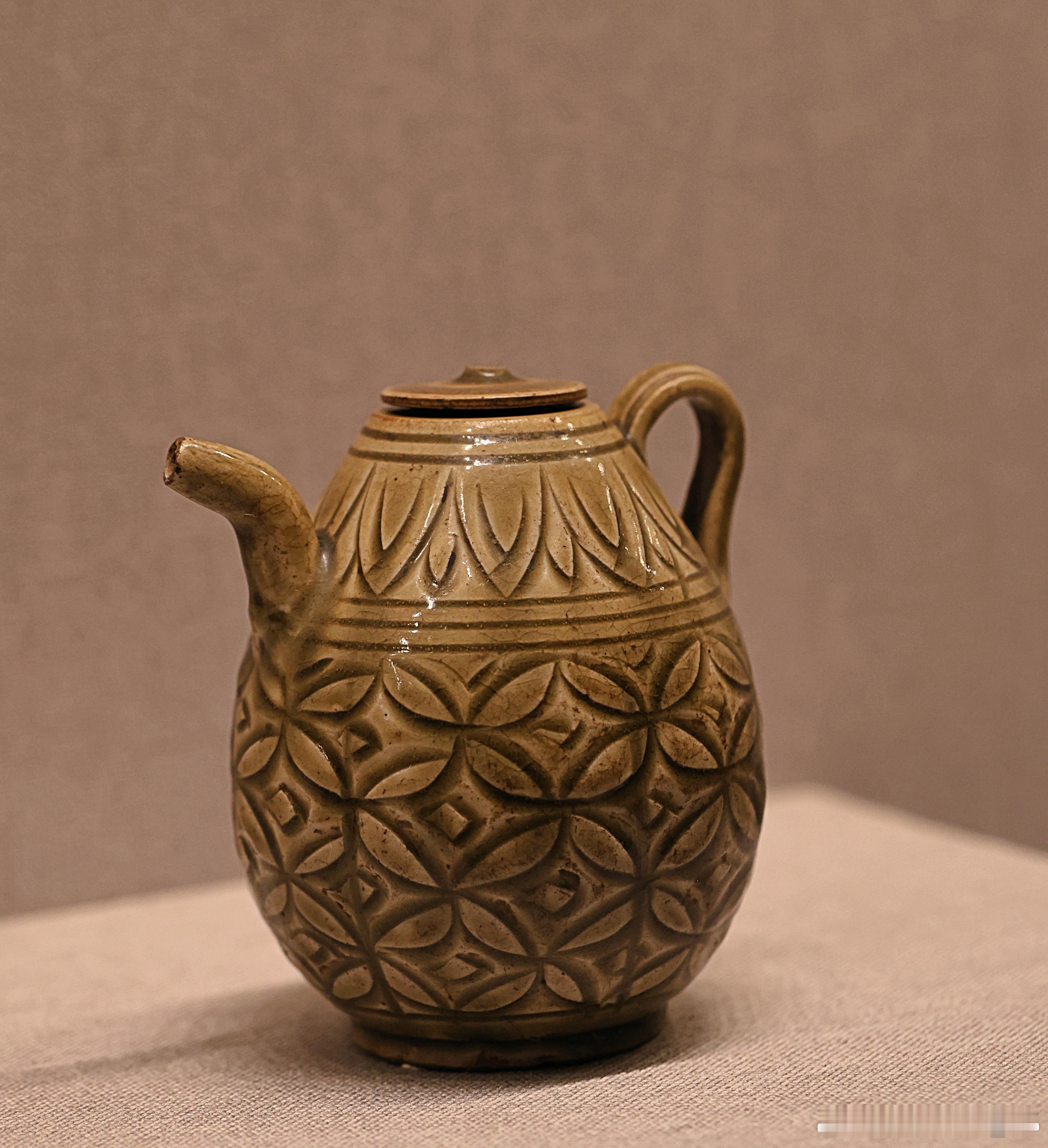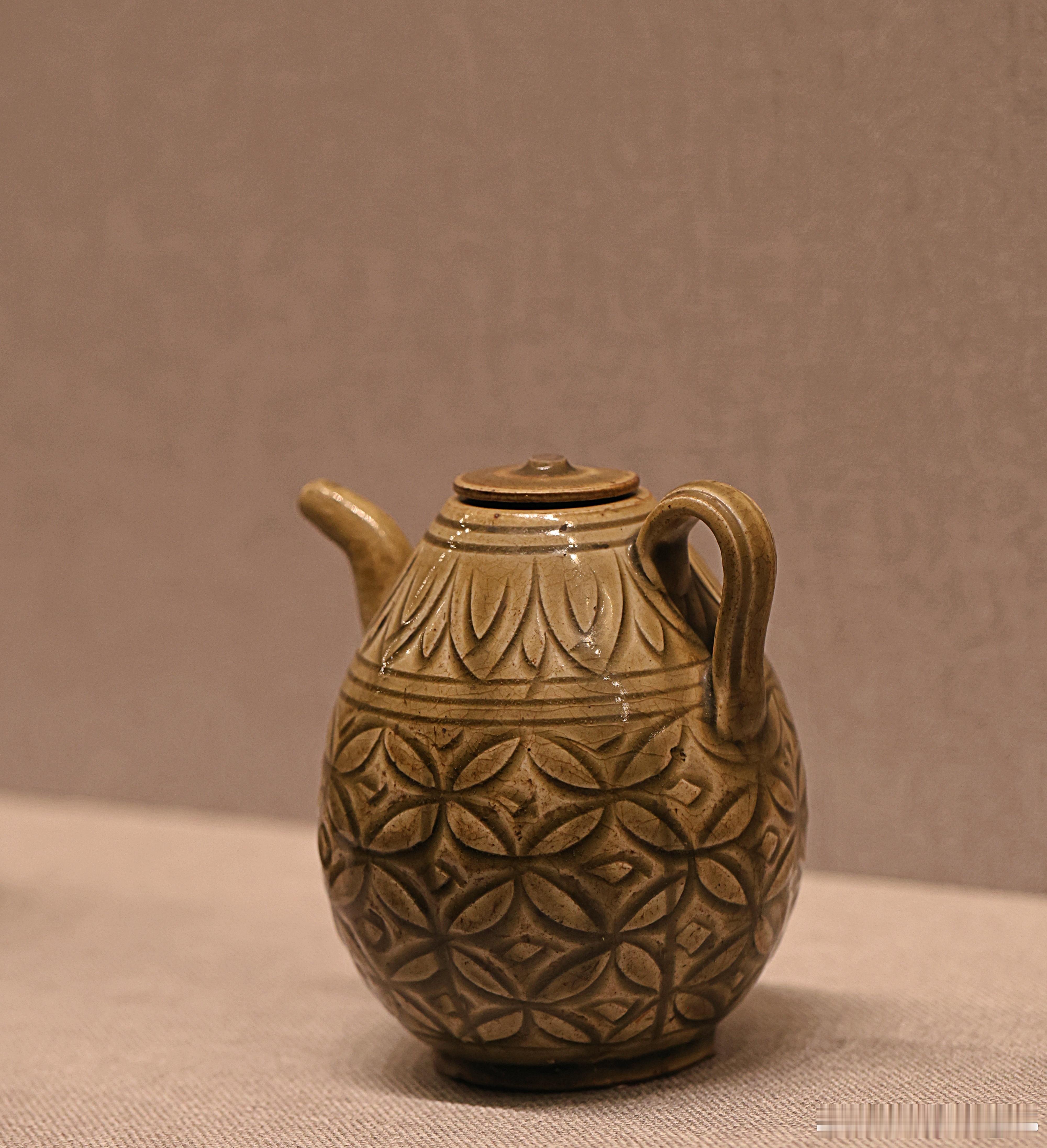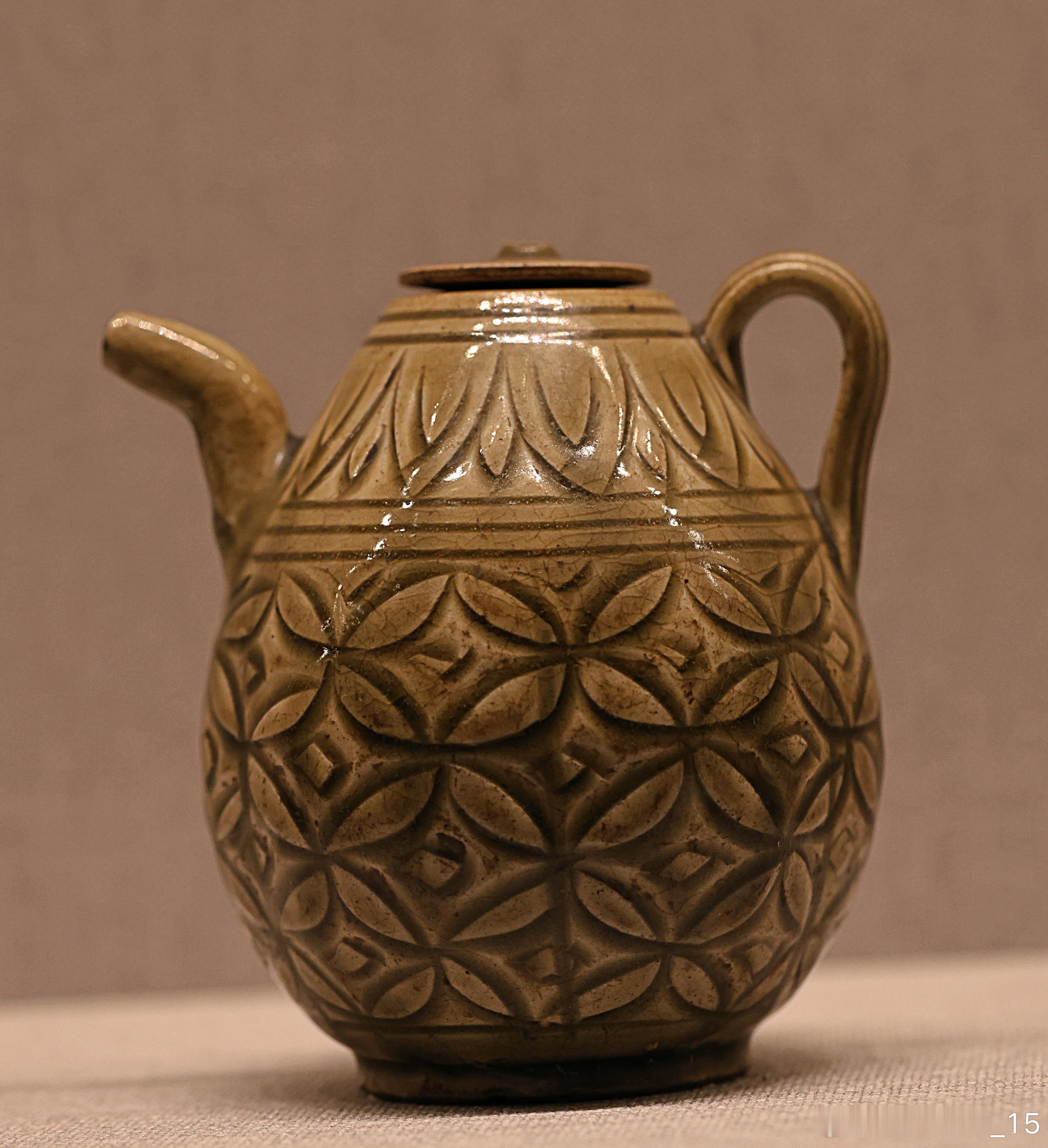 耀州窑青釉刻球路纹执壶金 (1115-1234)故宫博物院藏执壶小口,溜肩,鼓腹,圈足。肩部一侧置弯流,与之相对一侧口、肩之间置曲柄。执壶附平顶小圆盖。内、外和圈足内均施釉,釉色青黄。外壁刻花装饰。肩部刻双重覆莲瓣纹,腹部刻球路纹。刀工犀利、纹饰清晰,具有较强立体感。