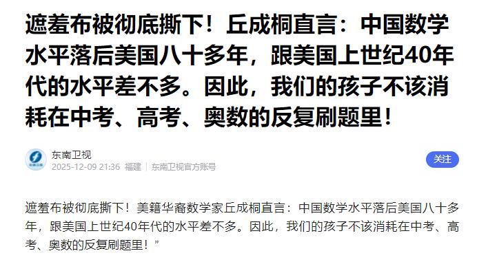 遮羞布被撕下!美籍华裔数学家丘成桐直言:“中国数学水平落后美国八十多年,跟美国上世纪40年代的水平差不多。因此,我们的孩子不该消耗在中考、高考、奥数的反复刷题里!” 这些年咱们的数学论文数量噌噌往上涨,有的统计里都排到世界第二了,看着挺热闹。可内行都知道,真正的硬指标是“篇均被引次数”。 汤森路透的数据显示,近十年咱们数学论文的篇均被引才2.95次,在世界上排36名,连前20都摸不着;再看美国,论文总数和总被引都是第一,篇均被引4.7次,稳稳排在第四。 这意味着什么?咱们十篇论文的影响力,可能还顶不上人家一篇,就像写了厚厚一本日记,自己看得挺投入,可翻的人一个没有,这能算真正的成果吗? 最能体现差距的还是菲尔兹奖,这个被称为“数学界诺贝尔奖”的荣誉,从1936年设立到现在,美国高校培养出的获奖者一抓一大把。 光哈佛大学就有18人,普林斯顿大学也有17人,可咱们中国大陆至今还是空白。 丘成桐太清楚顶尖人才需要啥了,他自己就是靠着对数学的热爱和持续的思考才拿奖的,而不是靠刷题刷出来的。 美国密尔沃基公立学校教六年级几何,根本不搞刷题那一套,直接让孩子当校园设计师,算花坛的面积、量围栏的长度,还得考虑光照和排水问题。 这样学出来的孩子,遇到新问题根本不慌,因为他们掌握的是解决问题的方法,不是死记硬背的套路。 就连美国的数学竞赛,题目也都是算社区垃圾回收路线、设计校园活动预算这种实用题,没有标准答案,就是鼓励孩子放开了想。 更让人感慨的是AI领域的对比,谷歌DeepMind旗下的高级版Gemini模型,已经能在国际奥数竞赛里拿金牌了。 它在2025年的比赛里解对了6道题中的5道,拿到35分的金牌成绩,解题思路还被评委夸“令人惊叹”。 可咱们的AI数学工具,大多还在围着中学练习题打转,根本没摸到高阶思考的门。 这真不是孩子不聪明,而是刷题模式把他们的天赋都磨没了,现在不少孩子背熟一千多种套路拿了奖,上大学学高等数学却一塌糊涂,根本没懂数学逻辑,只是个会做题的工具。 其实改变也没那么难,关键是把数学从题海里拉回生活里。 教概率的时候,带孩子分析球赛胜负的可能性;学函数的时候,让他们帮着做家庭月度预算;讲几何的时候,拿家里的家具说说图形的特性。 当孩子发现数学能解决真问题,能帮自己看懂世界,兴趣自然就来了。 落后不可怕,怕的是捂着遮羞布不愿承认,更怕用错误的方式消耗孩子。美国上世纪四十年代能出冯·诺依曼这样的大师,靠的不是刷题,而是对科学的探索精神。 咱们现在缺的不是努力的孩子,是能让孩子自由思考的土壤。把课堂还给孩子,把思考的权利还给孩子,别再用分数绑架他们的成长。 等有一天,孩子们讨论数学时眼里闪着光,而不是一提到数学就想到刷题套路,中国的数学大师自然就会冒出来。