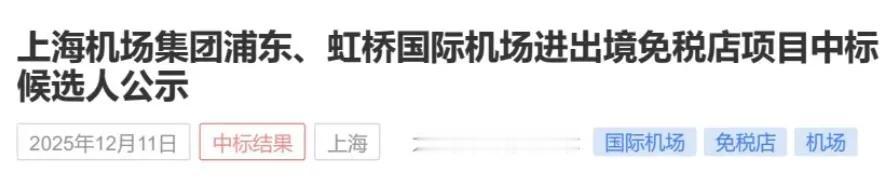 日上彻底出局12月11日,上海机场新一期免税店特许经营权招标结果公布,在上海机场运营免税店长达26年的日上免税行最终无缘续签,中标方为全球免税巨头杜福睿和国内免税龙头中免集团。今年11月,上海机场集团对未来8年的免税店特许经营权进行招标,主要涉及浦东和虹桥机场三个航站楼的进出境免税店项目三个标段。根据中标公示,中免集团拿下上海浦东国际机场T2航站楼及S2卫星厅国际区域,以及上海虹桥国际机场T1航站楼国际区域两个标段的进出境免税店的运营资格。杜福睿则中标上海浦东机场T1航站楼及S1卫星厅国际区域的进出境免税店运营,此次中标也是其首次大规模进入中国机场的免税领域。值得注意的是,此前一直运营上海机场免税店业务的日上上海,此次无缘续签,原因是未能获得公司大股东支持投标,而日上上海目前的控股股东,正是中免集团。目前,日上上海由中免集团控股约51%,其余的股份由外资创始股东佰瑞投资有限公司和上海机场全资子公司持有