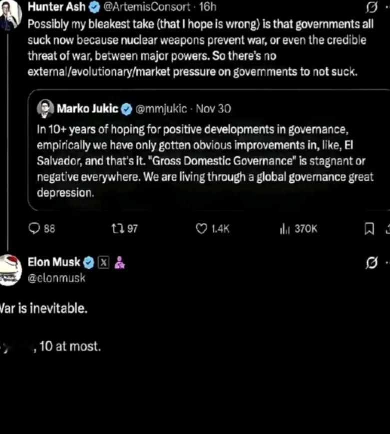 马斯克凌晨3点不睡觉,直接给全世界泼了一盆凉水。他在网上断言:战争无法避免,就在未来5到10年。   可能有人会觉得,马斯克是不是在危言耸听?毕竟现在看着还算太平,怎么就说未来几年一定会打仗呢?其实他这话不是凭空猜的,而是看到了现在世界上已经冒出来的好多苗头,这些问题会在未来五到十年越积越严重,慢慢就可能把矛盾推到爆发的边缘,不是他想吓唬人,是实实在在的风险就摆在那儿。   咱们先说说最基本的,大家过日子都离不开的资源,现在已经不够抢了。就像家里买菜要是供不上,邻居之间都可能闹别扭,国家之间更是这样。比如水、矿石这些东西,越来越多的国家在抢。   有两个非洲国家,就因为一条大河的水资源吵得不可开交,一方修了大坝蓄水,另一方的农田就没水浇,庄稼减产,老百姓没饭吃,最后直接派兵对峙,打了好几次仗,不光人死了不少,那条河的灌溉系统也被炸毁了,以后大家都没水用。   还有些地方因为地下有值钱的矿石,两个国家抢来抢去,矿山都被炸停了,矿石运不出去,全球的价格都跟着涨,这种为了抢资源闹起来的冲突,最近几年比以前多了快七成,以后资源只会更紧张,抢得更厉害,冲突自然就容易升级。   再说说科技这事儿,本来是让大家日子过好的,现在反而让战争的门槛变低了。以前打仗得靠人扛枪、大炮轰,现在不一样了,无人机能在几百公里外遥控打人,有些甚至不用人指挥,自己就能识别目标开火。   马斯克最担心的就是这个,现在大国都在搞这种“聪明武器”,没人能保证这些机器不会出错。万一哪个无人机认错了目标,炸到了别的国家,或者被恐怖分子拿到手,随便在港口、城市搞破坏,想拦都拦不住,很可能一下子就把矛盾挑起来。   而且现在各国在科技上也闹得挺僵,你不让我用你的芯片,我不让你用我的技术,互相封锁。就像造电动车、手机需要的关键材料,有的国家想垄断,有的国家怕被卡脖子,就拼命抢,这种科技上的争斗越来越激烈,最后说不定就会变成真刀真枪的冲突。   还有现在的地缘局势,本来就有好多火药桶,稍微有点火星就可能炸。比如俄乌打仗已经好几年了,两边耗着,欧洲好多国家跟着受牵连,经济下滑,老百姓过日子都难。更麻烦的是,有些国家还冻结了对方的资产,想着用这个施压,可对方也说了要报复,要扣下他们在当地的公司资产。   这就不是战场上的事儿了,连商业、钱财都卷进来了,矛盾越来越复杂。还有中东那边,一直就没太平过,现在红海那条重要的航道也不顺畅,商船被袭击,好多货物运不出去,油价、运费都跟着涨,影响到好多国家的生计。这些热点地区的冲突不是孤立的,牵一发而动全身,未来几年要是再出点意外,很可能就会把更多国家卷进去。   另外,现在各国之间的合作越来越少,反而互相提防,以前大家一起造东西、做买卖,产业链互相连着,谁也离不开谁,自然不会轻易打仗。可现在不一样了,有些国家想着“自己干”,把工厂迁回去,限制货物出口,搞“脱钩断链”。比如造芯片的关键技术,有的国家不让卖给别的国家,导致好多工厂开不了工,经济受影响。   这种互相拆台的做法,让各国之间的信任越来越少,矛盾越来越多。而且全球经济本来就不好,好多国家日子难过,内部问题解决不了,就可能想转移矛盾,找别的国家的麻烦,这也是引发战争的一个重要原因。   还有一个容易被忽略的点,就是人工智能带来的问题。现在AI越来越厉害,不光能帮着干活,还能用来打仗、造谣。比如用AI做假视频、假新闻,随便编个“某某国家要动手了”的消息,很可能就会误导民众,让国家之间产生误会。   而且AI还会抢好多人的工作,工厂里的工人、办公室的职员,甚至一些技术岗位,都可能被机器替代。未来几年,失业的人会越来越多,社会不稳定,也会让国家之间的矛盾更容易爆发。马斯克作为搞科技的,比谁都清楚这些技术一旦失控,会带来多大的风险。   所以说,马斯克的预测不是空穴来风,未来五到十年,资源不够抢、科技竞争变激烈、地缘冲突没解决、各国互相提防、AI失控这些问题会凑到一块儿,让战争的风险越来越高。不是说一定会打大仗,但局部冲突很可能会越来越多,甚至有可能升级成更大规模的战争。   他凌晨不睡觉发这个消息,其实是想给全世界提个醒,这些问题再不重视、不解决,真的可能会酿成大祸。咱们普通人可能觉得战争离自己很远,但其实世界上的各种矛盾都在慢慢积累,未来几年真的有可能发生变故,这也是马斯克为啥这么笃定的原因。