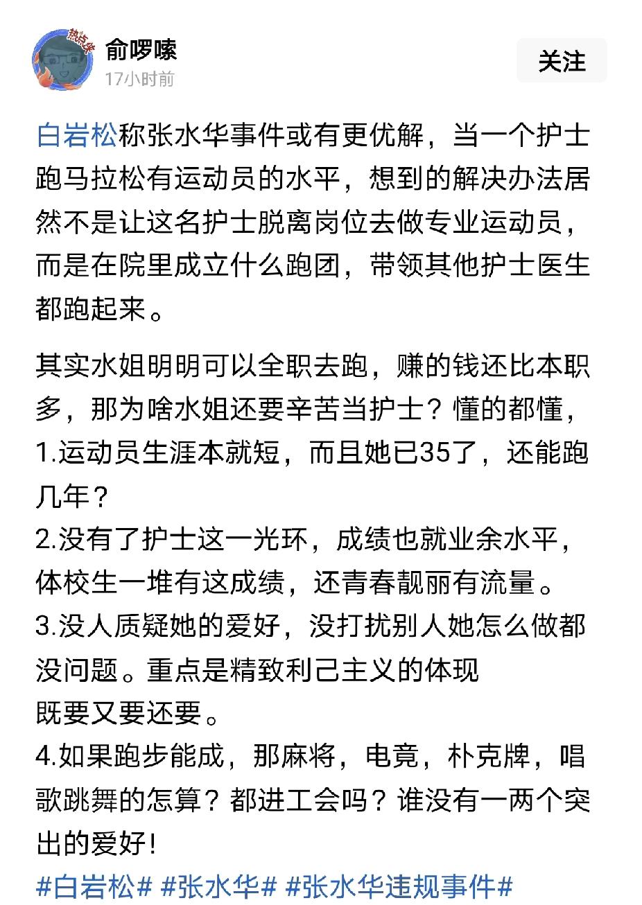 白岩松:何不食肉糜 晋惠帝,公元290年到307年在位。他在位期间,留下一句千古名句:何不食肉糜。 没想到在1700多年后的2025年,我们也能再次见证"何不食肉糜",那就是白岩松评张水华。 身居高位久了,白岩松已经习惯于占据高位,站在道德的制高点居高临下评价他人,却丝毫不知民间疾苦。 全国那么多护士,干本职工作,没有正常的双休假和节假日,常年上夜班,时不时还得白+夜连轴转,他看不见,不发声。 就那么一个把自己的利益建立在同事付出上的张水华,他看见了,然后一番高谈阔论,说什么全民跑步,调到工会。 拜托,因为张水华占用休息时间,她的同事想好好休息都不成,还谈什么全民健身。 说大话谁不会说,合着占用的不是你白岩松的休息时间。 此外,为什么张水华就该调到工会,是不是在白岩松的潜意识中,工会就是吃闲饭的地方,可以自由支配时间。 这么被公开吊打了,工会不出来说两句话? 白岩松 张水华 护士