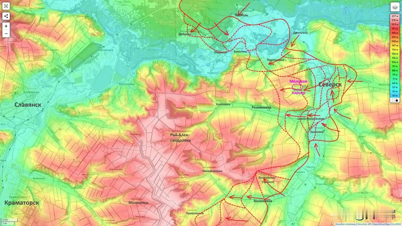 截至12月15日晨:斯拉维扬斯克战役拉开帷幕 🟥 正如先前所述,乌军放弃谢韦尔斯克后,未能在城市西部的高地组织有效防御; 🟥 乌军部队已被逐出白垩矿场区域,并从圣波克罗夫方向被击退回雷兹尼科夫卡。该地现已爆发战斗; 🟥 俄军成功突入雷兹尼科夫卡(几乎是紧贴撤退乌军攻入该地)至关重要。依托雷兹尼科夫卡和卡列尼基两村几乎连片的居民区(可作为进攻支点),俄军可沿苏霍伊河河谷一路推进至拉伊-亚历山德罗夫卡; 🟥 拉伊-亚历山德罗夫卡是通往斯拉维扬斯克的关键后勤枢纽。占领该地并以此为据点后,即可向斯拉维扬斯克(意为“斯拉夫人”)这座具有象征意义的城市发起进攻。