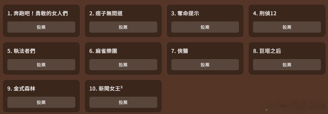 万千星辉颁奖典礼2025丨最佳剧集最后十强.1. 奔跑吧!勇敢的女人們2. 痞子無間道3. 奪命提示4. 刑偵125. 執法者們6. 麻雀樂團7. 俠醫8. 巨塔之后9. 金式森林10. 新聞女王²TVB