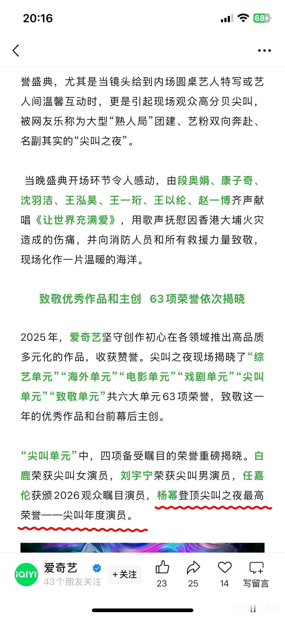 打脸了吧?杨幂奖项争议官方一锤定音! 都别吵吵了!爱奇艺官方亲自下场发话,白纸黑字写着杨幂荣获“尖叫年度演员”——这可是尖叫之夜的最高荣誉! 那些之前唱衰的、分析的、带节奏的可以歇菜了,官方直接甩结论,不比你们瞎猜强? 这波操作够痛快,直接终结所有扯头花场面。 奖项份量官方说了算,粉丝不用再费劲解释,路人也看得明明白白。 杨幂今年作品热度摆在那儿,拿这个奖有什么问题?有些人就是戏太多! 说到底娱乐圈还是得靠实绩说话,官方认证就是最硬的底气。