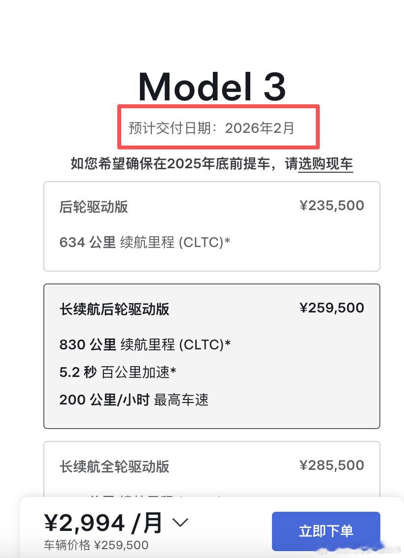 Model 3长续航后驱版,提车时间也更新到2026年2月。特斯拉