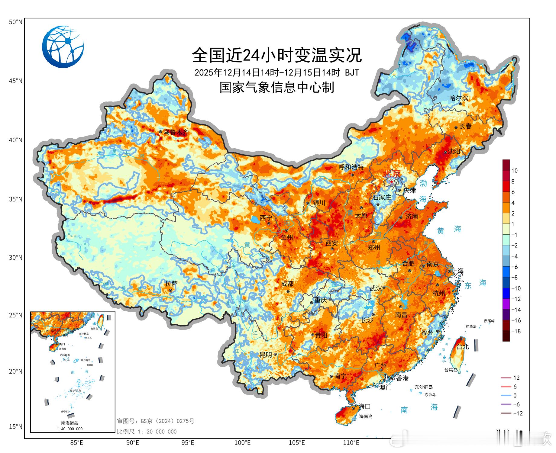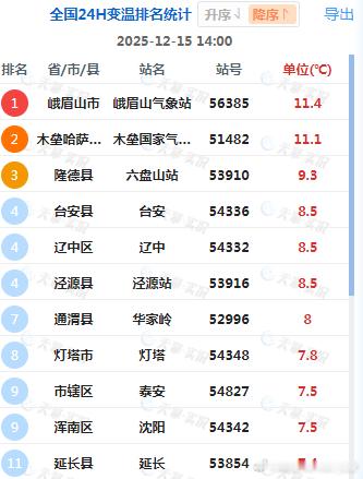 【升温】今天我国大部地区气温回升。四川峨眉山升11.4℃、新疆木垒升11.1℃、宁夏六盘山升9.3℃,为14时全国升温前三站点。14时0℃线北抬到内蒙古和辽宁吉林交界一带。