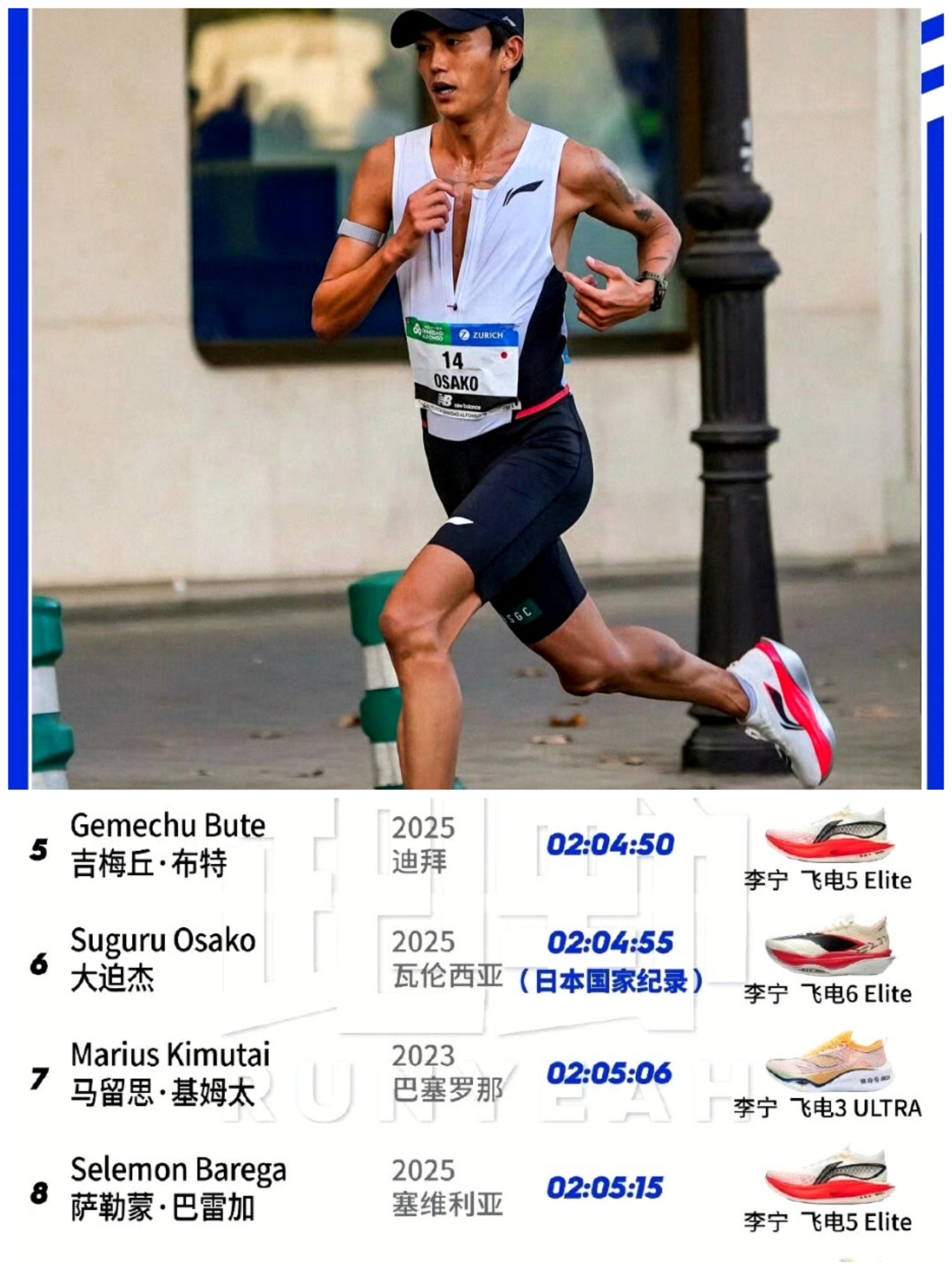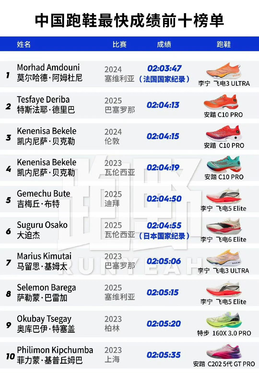 中国品牌跑鞋马拉松最快成绩Top10(截至2025年12月)李宁飞电3 Ultra:2:03:47法国选手Amdouni Morhad于2024年塞维利亚马拉松创造,刷新法国国家纪录,是目前中国跑鞋的最高成绩。李宁飞电3 Ultra:2:04:19贝克勒在2024年瓦伦西亚马拉松穿着,此前为中国跑鞋最快纪录。李宁飞电5 Elite:2:06:26埃塞俄比亚选手Samsom AMARE在2024年上海马拉松夺冠。特步冠军版跑鞋:2:06:57何杰在2024年无锡马拉松打破中国男子马拉松纪录。李宁飞电3 Ultra:2:06:28埃塞俄比亚选手Abate Tadu在2022年柏林马拉松斩获季军,创当时中国跑鞋六大满贯最佳战绩。特步冠军版跑鞋:2:07:53肯尼亚选手JOSPHAT BOIT在2024年重庆马拉松破赛会纪录夺冠。特步冠军版跑鞋:2:08:04吴向东在2024年大阪马拉松跑出中国历史第四佳绩。特步冠军版跑鞋:2:08:07杨绍辉在2025年厦门马拉松夺冠,刷新中国籍选手赛会纪录。安踏C10PRO:2:16:36科斯盖在2025年上海马拉松创中国境内女子最快成绩(非中国品牌专属,但赛事成绩计入榜单)。中乔体育跑鞋:2:09:29桑吉东知在2024年赛事刷新PB,跻身中国马拉松历史前十。