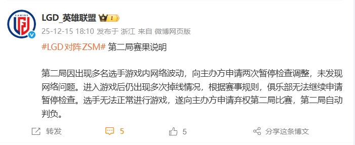 “第二局因出现多名选手游戏内网络波动,向主办方申请两次暂停检查调整,未发现网络问题。进入游戏后仍出现多次掉线情况,根据赛事规则,俱乐部无法继续申请暂停检查。选手无法正常进行游戏,遂向主办方申请弃权第二局比赛,第二局自动判负。”