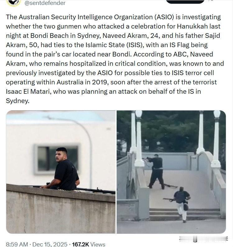 澳大利亚安全情报组织(ASIO)正在调查,昨晚在悉尼邦迪海滩袭击一场光明节庆祝活动的两名枪手——24 岁的 Naveed Akram 及其 50 岁的父亲 Sajid Akram——是否与伊斯兰国(ISIS)有关联。警方在两人停在邦迪附近的车内发现了一面 IS 旗帜。据 ABC 报道,目前仍在医院接受救治、情况危急的 Naveed Akram 早在 2019 年就曾因可能与 ISIS 在澳恐怖小组有关联而被 ASIO 盯上并接受调查;当年恐怖分子 Isaac El Matari 因涉嫌代表 IS 策划在悉尼发动袭击而被捕。
