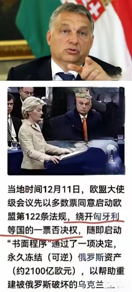 这大概是欧尔班这辈子最无奈、最痛苦,也最无助的时刻。欧盟直接撇开匈牙利,单独组织投票,硬是通过了永久冻结俄罗斯财产的决议。 没人能猜透欧尔班此刻心里翻涌着什么。他脸上满是哀怨的眼神,藏不住的愤怒全都写在脸上。 明明自己一直顶着压力反对这项决议,不想跟着欧盟一条道走到黑,可终究抵不过多数票的碾压,连被尊重的话语权都没得到。 他心里清楚,欧盟这是故意无视匈牙利的立场,为了迎合西方阵营,压根没把匈牙利的利益放在眼里。 可就算再愤怒、再不甘,他也没多少反抗的底气。匈牙利毕竟是欧盟成员国,经济、外交上都离不开欧盟的绑定,真要闹到彻底撕破脸,吃亏的还是自己。 这种明明看清局势,却无力改变的感觉,比单纯的失败更让人煎熬。他只能眼睁睁看着决议落地,看着自己的坚持变成一场笑话,那种孤立无援的滋味,恐怕只有他自己最清楚。匈牙利欧盟 欧盟法令
