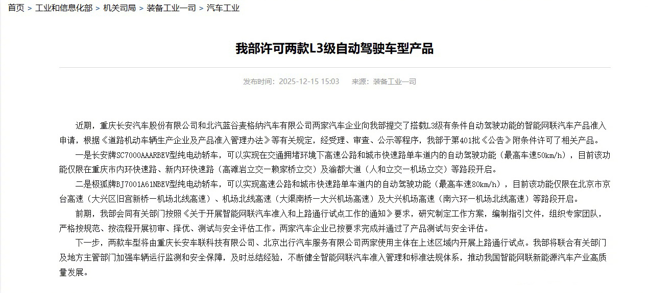 长安和极狐两款车型获得L3级自动驾驶功能准入许可。试点安排在重庆和北京的部分固定路段。L3级辅助驾驶定义:在特定设计运行条件下,系统可实现自动驾驶,即执行全部驾驶任务,从而让用户在该条件下从驾驶任务中脱离出来,但用户仍需保持接管能力。