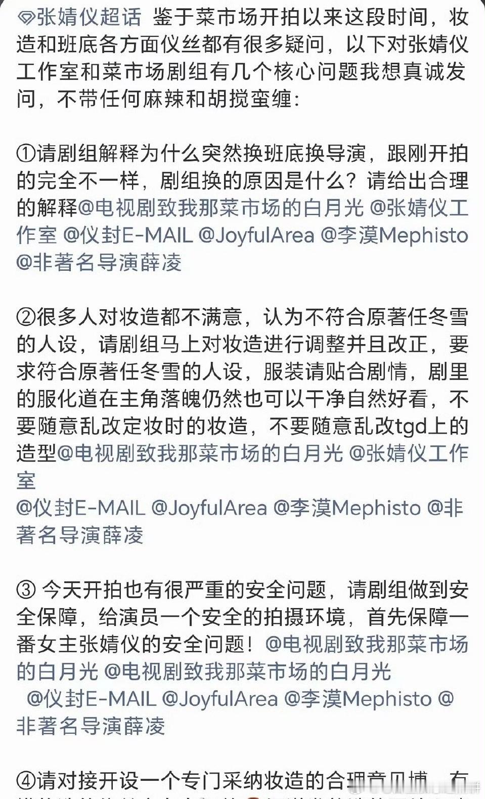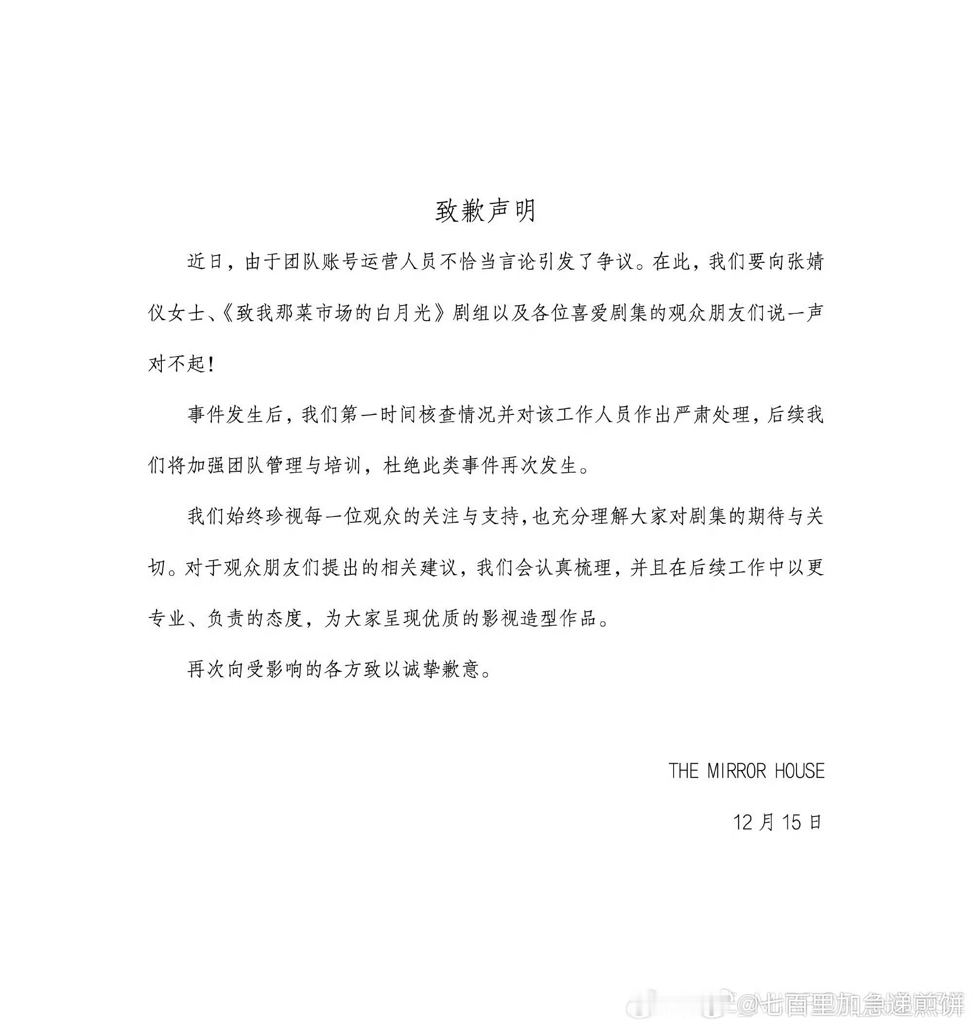 电视剧《致我那菜市场的白月光》造型团队的道歉声明,向张婧仪、剧组以及观众致歉,并对发表不当回应的stf进行了严肃处理,表示将努力杜绝此类事情发生