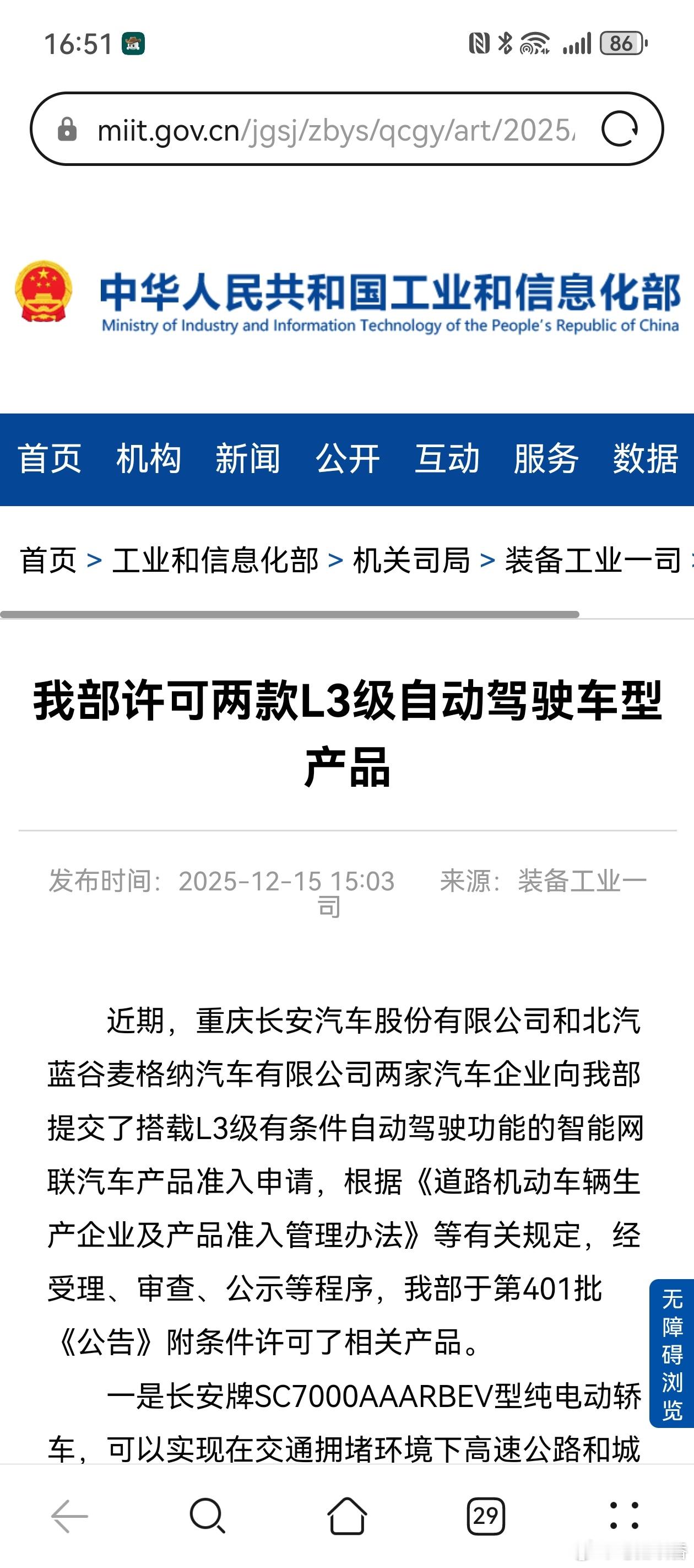 【两款L3级自动驾驶车辆获批】一是长安牌SC7000AAARBEV型纯电动轿车,