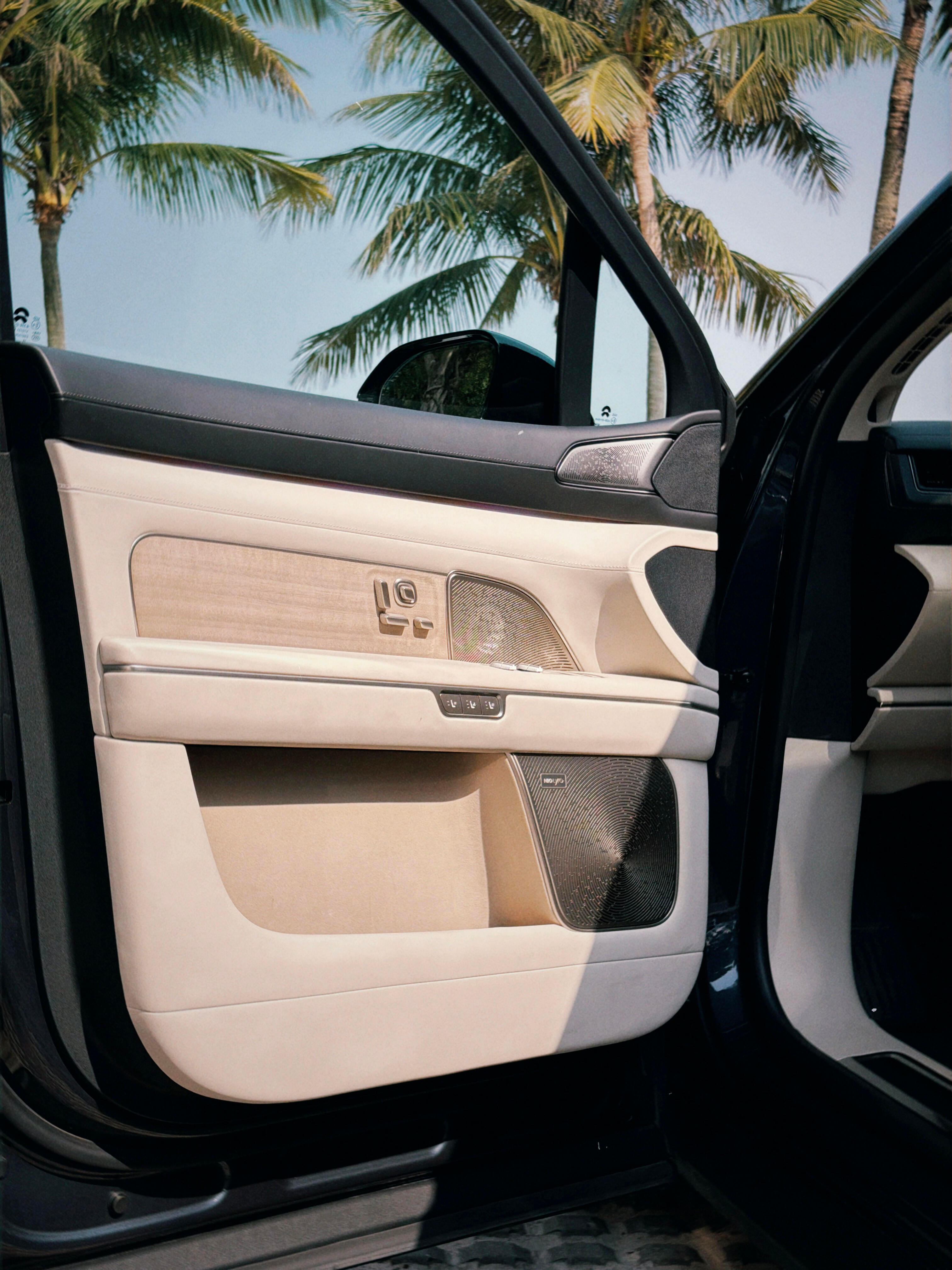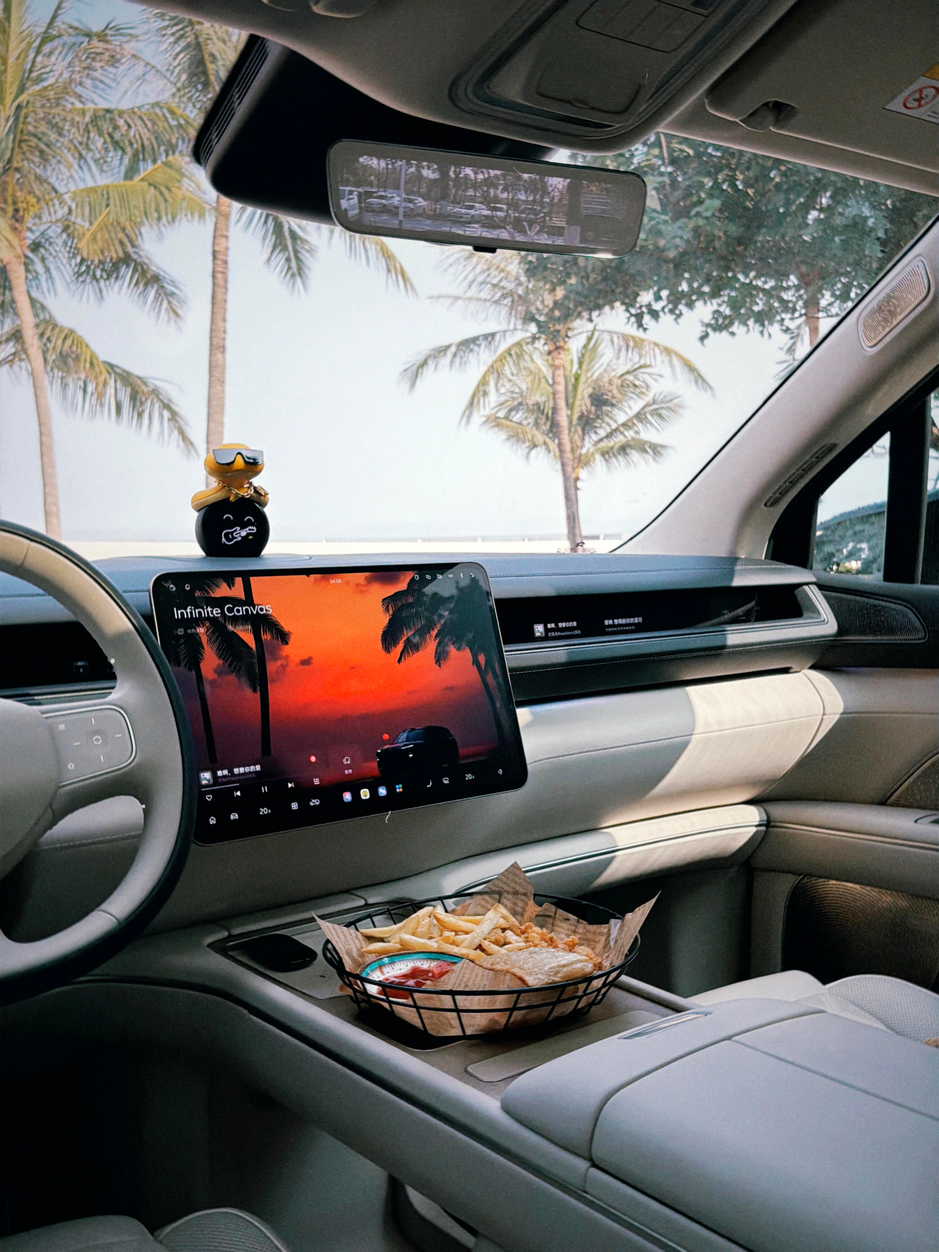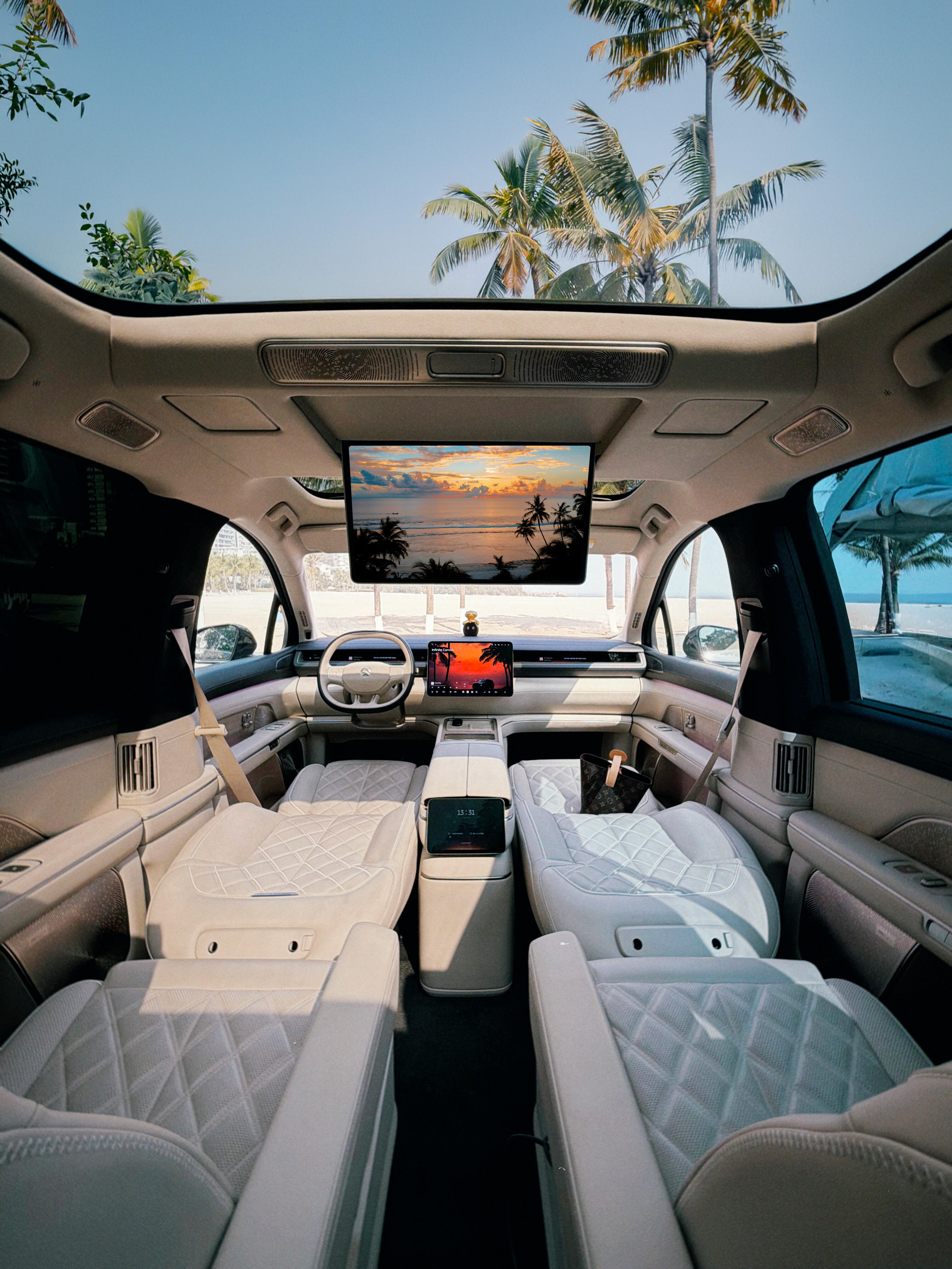 es8的沙发床模式,躺下一眼望去就是沙滩和大海,简直不要太爽