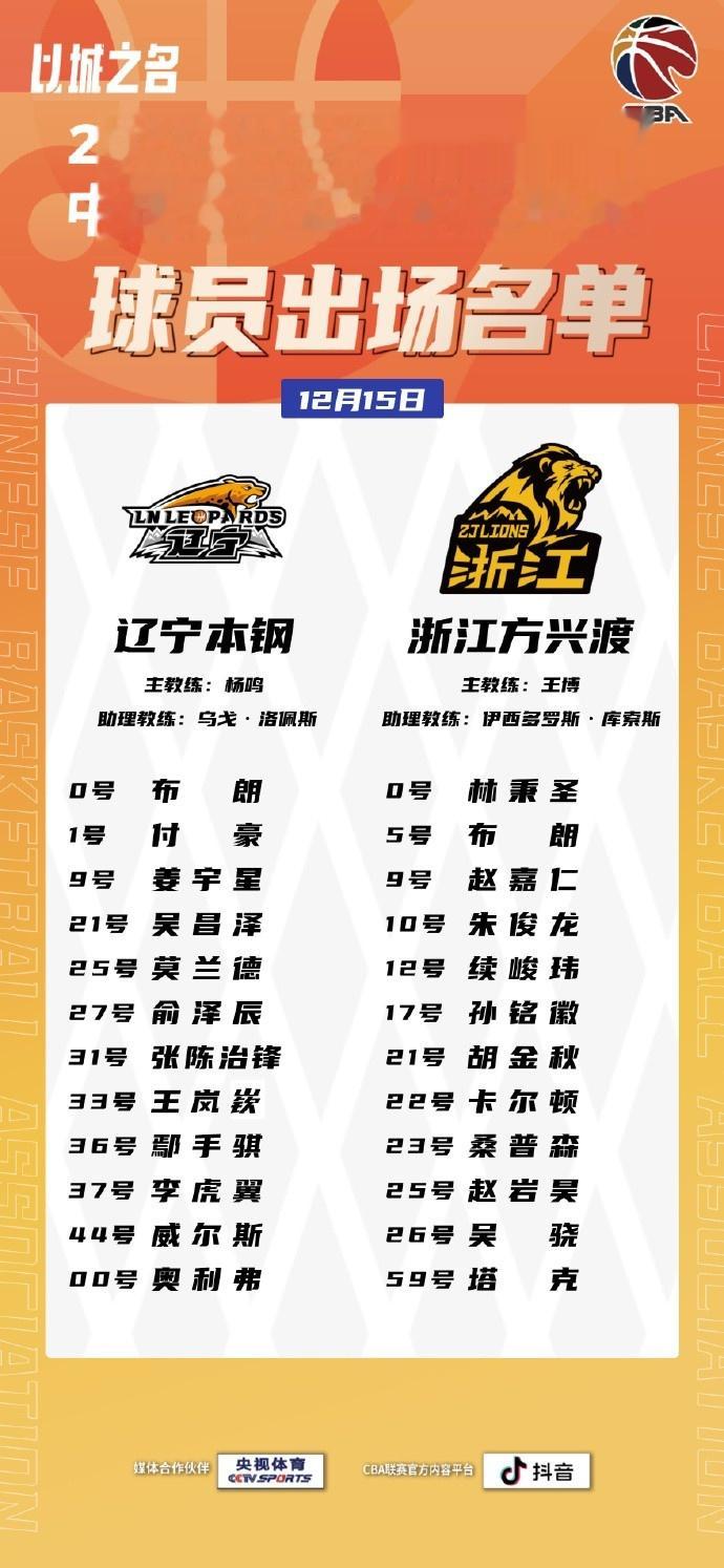 两队本场比赛的大名单已经出炉,辽宁男篮为:布朗、付豪、姜宇星、吴昌泽、莫兰德、余泽辰、张陈治锋、王岚嵚、鄢手骐、李虎翼、威尔斯、奥利弗。