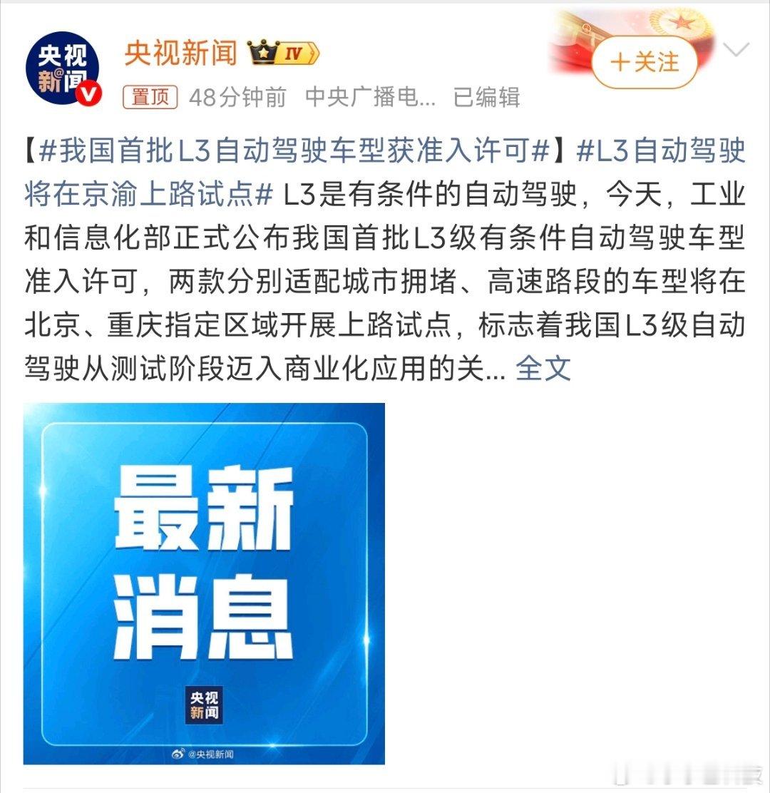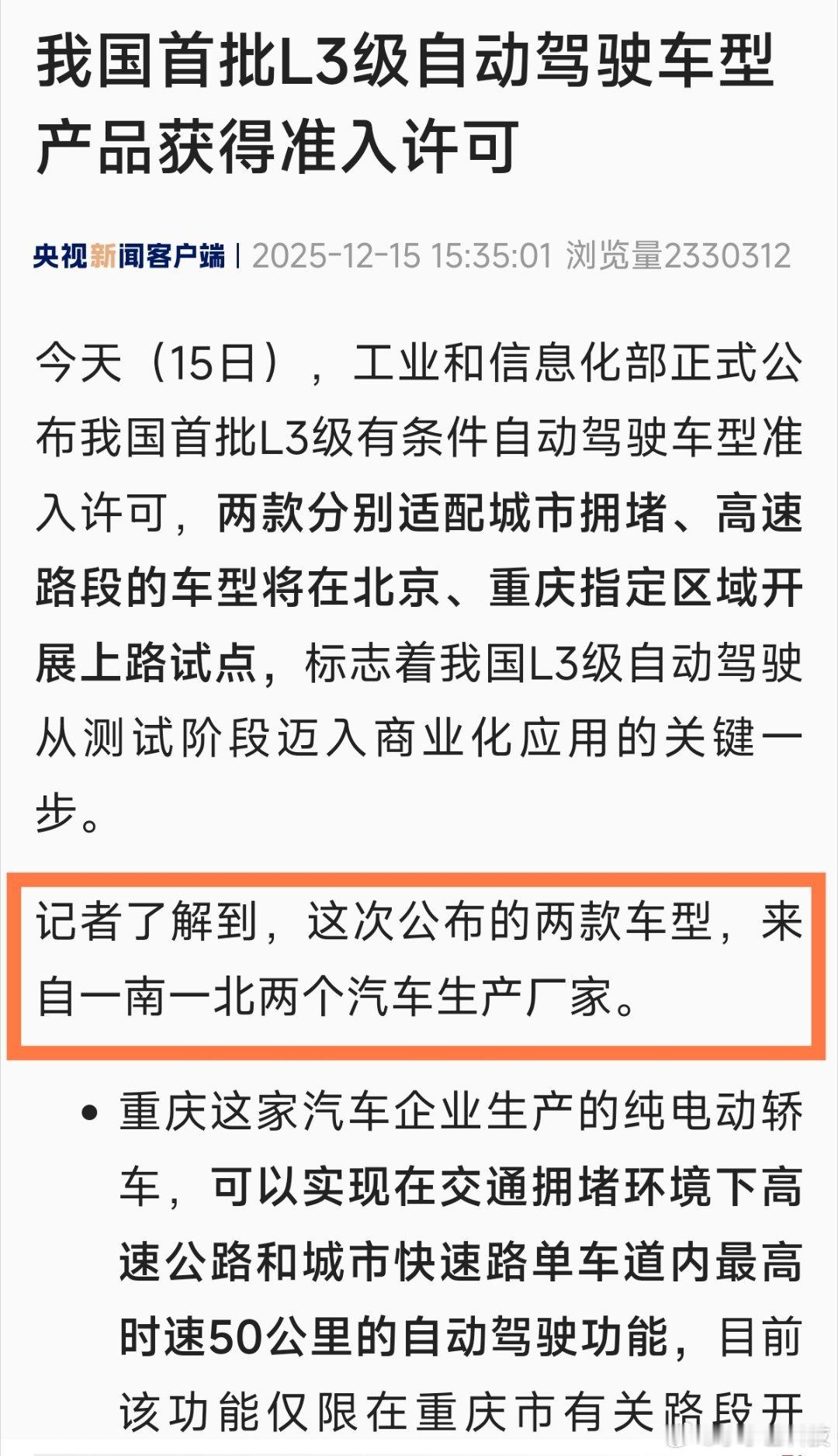 L3终于来了,两款车型分别来自一南一北两个车厂,将会在北京+重庆指定区域开展上路
