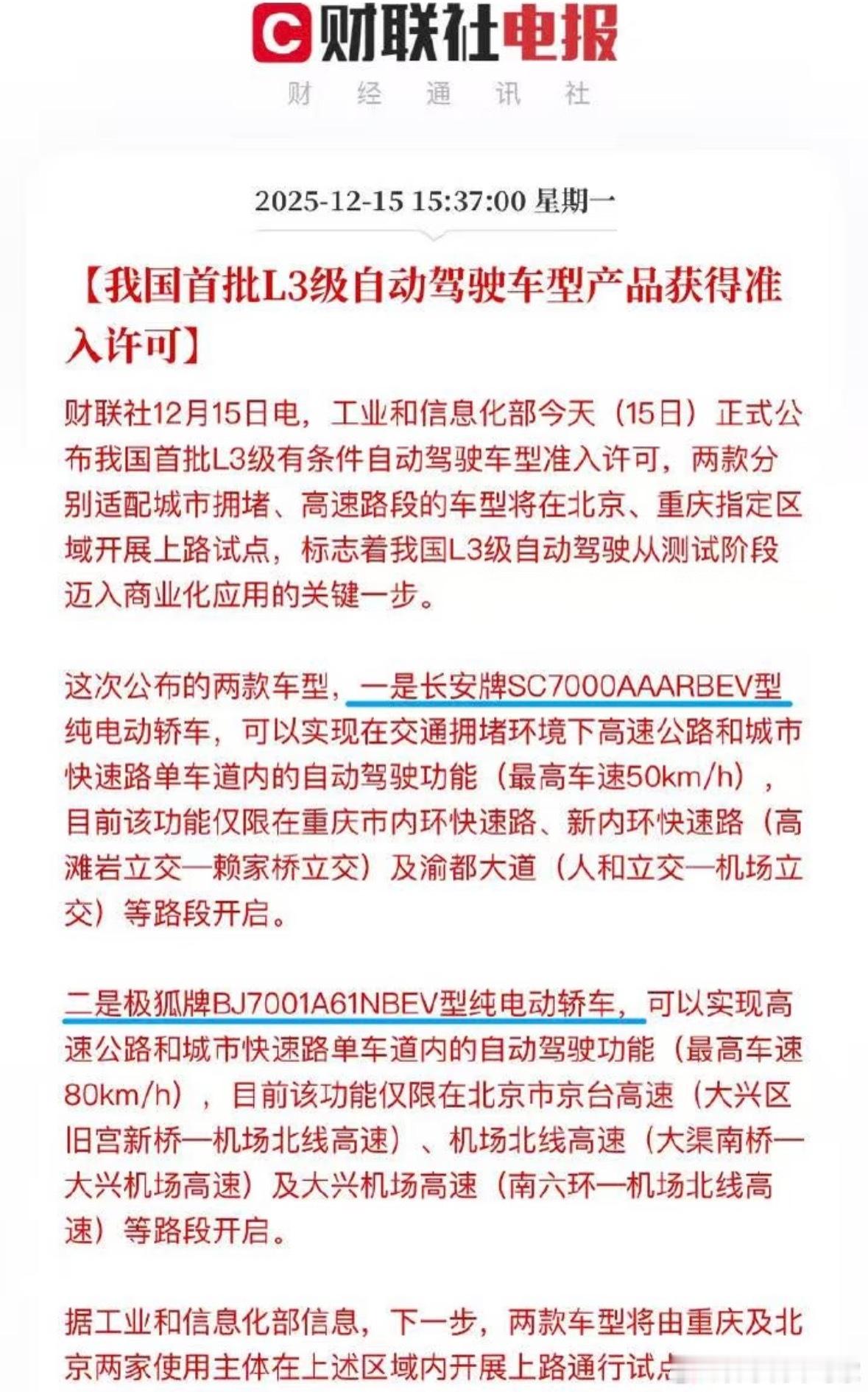见证历史,L3时代来了,注意看官方说的是L3级自动驾驶,而不是辅助驾驶,首批企业为北汽和长安,试点部分为高速路和快速路,城区慢速路估计还要等等,但是根据分类L3责任人还是驾驶员,你觉得固态电池和L3哪个能先量产呢?L3大V聊车 我国首批L3自动驾驶车型获准入许可