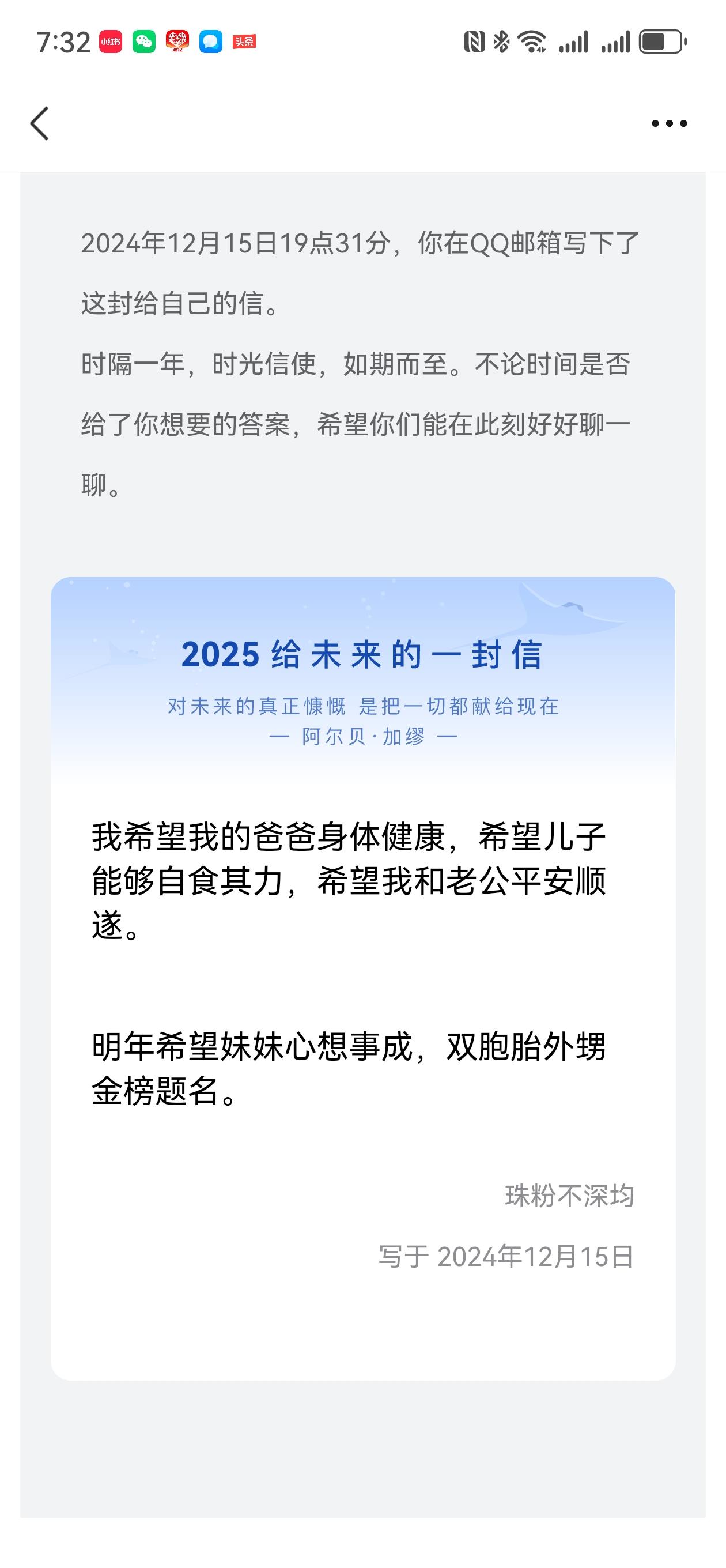 看见了一年前写给自己的一封信。瞬间泪目。 一年前,我希望爸爸身体健康,如今他做完手术回家了,但愿一切安好。 我希望儿子能够自食其力,目前,他还需要我们每个月给钱。没有实现的愿望,不过问题不大。 我希望和老公平安顺遂。这个愿望实现了,这一年没有什么大问题。 我希望妹妹两个孩子金榜题名,这个愿望也实现了,两个孩子上了大学。 我所求的其实不多。爱我的人和我爱的人平安健康快乐就好。 2024年心愿清单