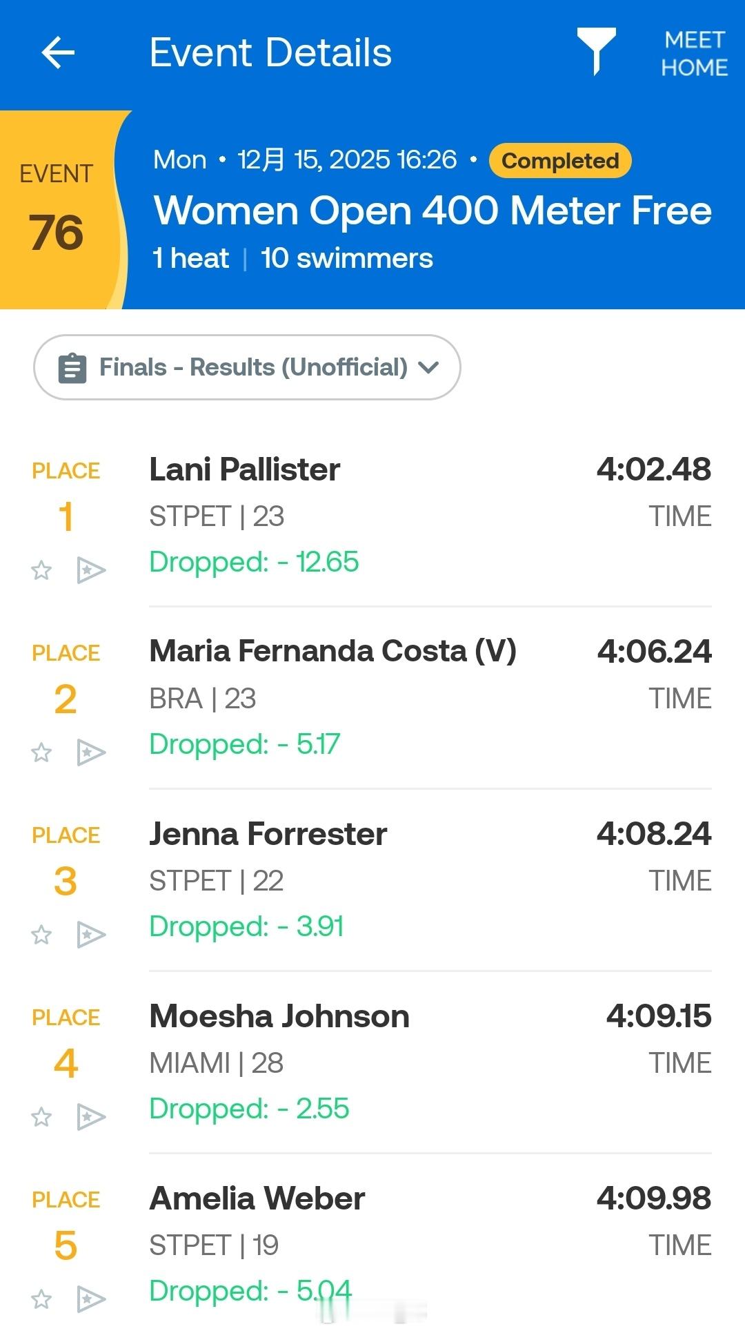 昆士兰州游泳锦标赛女400自决赛Pallister4:02.48