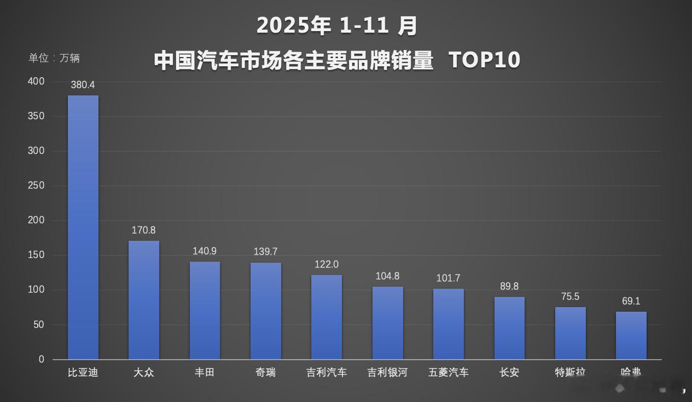 海外都快赶上奇瑞了,比亚迪的海外增速也太快了,目前在海外有先发优势,提前几年做出海,把品牌立起来了,国产车在外面这种配置同价位就是降维打击。进入四季度以来,高盛、花旗、摩根士丹利等国际顶尖投行密集发布深度研报,纷纷给予比亚迪“买入”或“增持”评级,看样子已经预见了比亚迪在海外会复制至在国内这5年的走势了。比亚迪的崛起,可能大家都免疫了,但我还是要说,比亚迪表现亮眼持续领跑,今年前11个月已经卖了418万辆,平均一天卖出超过1.2万辆,每年大几百万台的实力,持续保持,是一个合格的带头大哥。更猛的是海外,暴涨近300%,光11月就出口13万辆。以前总觉得“国产车出海”是口号,现在看比亚迪是真把路蹚出来了,今年海外破百万辆基本稳了。不光走量,高端线也起来了。方程豹月销冲到3.7万,直接超过蔚小理,还是挺让我刮目相看的;而且,仰望在百万级市场里稳稳站住。这说明什么?比亚迪不只是靠性价比,技术和品牌也在全线往上走。以前总说弯道超车,现在看,比亚迪更像是在新能源这条路上直接换了条道,而且越跑越快。今年剩下最后一个月,目标达成率已经91%,全年目标超额完成几乎没悬念了。