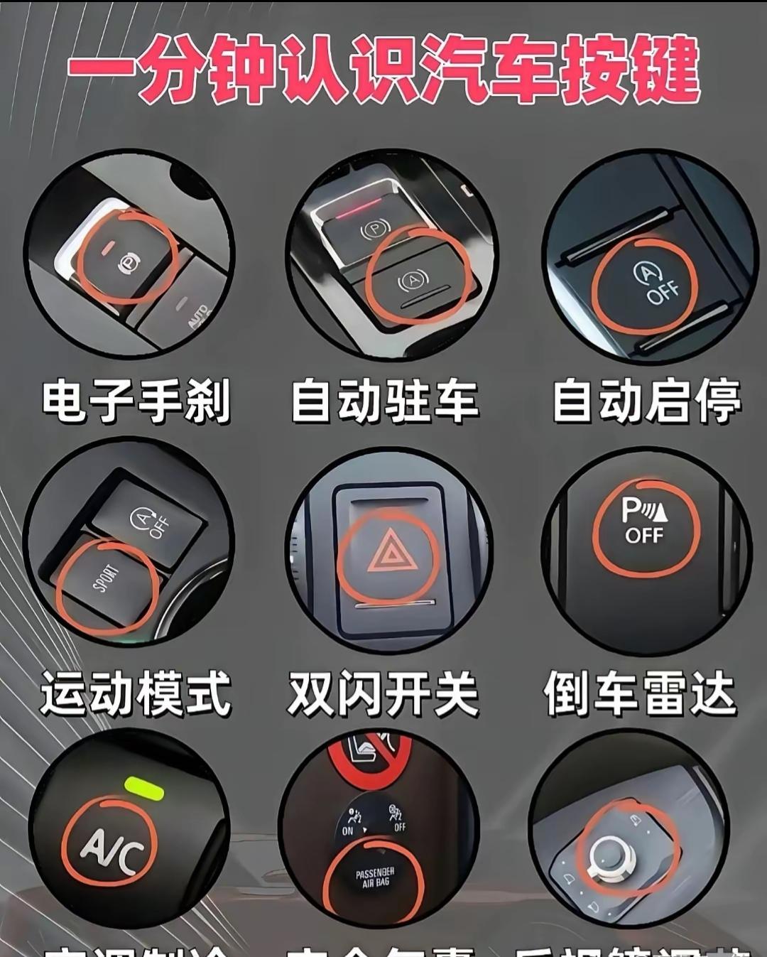 新手司机的福利,车内按键的作用 不会的赶紧保存下来好好看好好学。 大雾天还在开双闪的老司机,也可以学习一下,怎么开雾灯的。汽车按键功能 汽车功能按钮 雾天雾灯