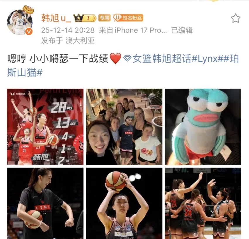 从昨天到现在,因为韩旭在WNBL焦点大战中斩获全场最高分,让诸多关注韩旭的网友倍感高兴,乃至兴奋不已,包括韩旭她自己。