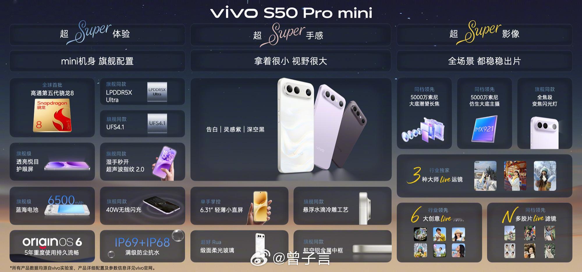 vivo S50 系列正式发布!定位 Z 世代中高端旗舰,以“我喜欢我,每秒都生动”为核心主张,推出标准版与 Pro mini 双机型,2999 元起解锁全场景体验~ 设计上主打“告白”等四款配色,独创纱缎光刻工艺搭配航空铝中框,标准版 7.49mm 超薄机身 + 196g 轻盈手感,Pro mini 为 6.31 英寸小屏适配单手操控。系统内置“电子装修”方案,趣味光栅锁屏 + 数百款主题素材,搭配定制磁吸周边,打造专属数字身份。影像堪称“长焦 Live 神器”,全系搭载索尼 IMX882 潜望长焦 + OIS 防抖,行业独家大师级运镜系统,支持高光慢动作、动态变焦等复合玩法,搭配 5000 万主摄与 800 万超广角,4K 换帧、路人消除等功能让创作更轻松,前置 5000 万镜头 + 柔光灯还原妈生好皮。性能拉满!Pro mini 全球首批搭载骁龙 8 Gen5,跑分破 300 万;标准版配骁龙 8s Gen3,全系 LPDDR5X+UFS 4.1 存储。6500mAh 大电池 + 90W 快充,Pro mini 额外支持 40W 无线充电,1.5K 护眼直屏 + 3D 超声波指纹 2.0,IP68/IP69 防水防尘更安心。vivo S50 2999 元起,vivo S50 Pro mini 3699 元起。