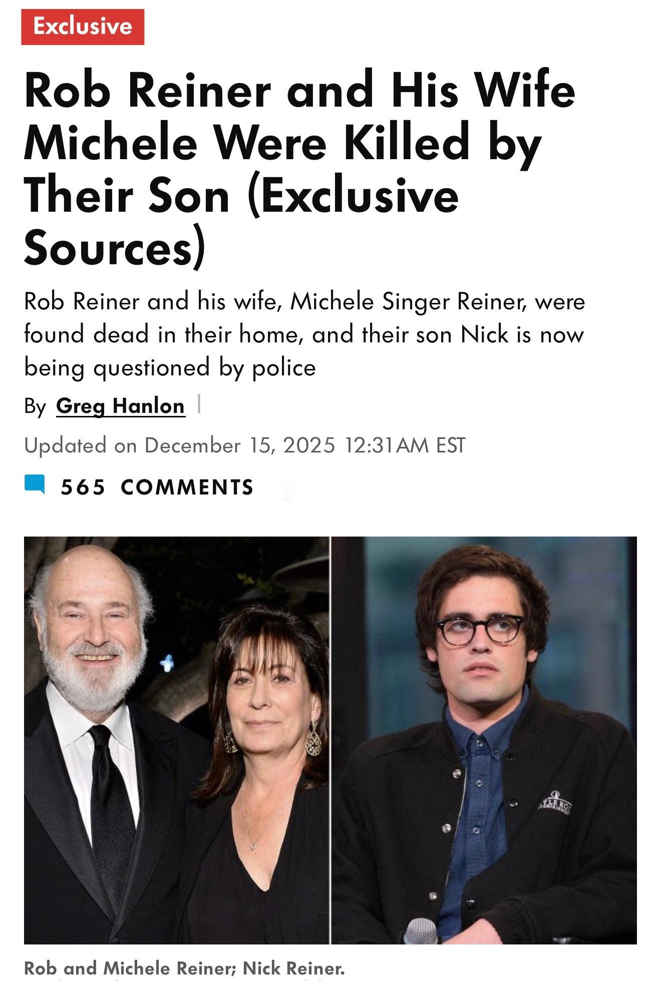 电影《怦然心动》的导演、本身也是演员的Rob Reiner(78岁)和太太Michele Singer Reiner(68岁)被发现陈尸家中,身上有刀伤。(图二是他们位于Brentwood区的家)《人物》杂志报道说,是他们的小女儿率先发现了尸体;而知情人爆料,他们的其中一个儿子Nick可能就是凶手(不过一切还有待警方的最后确认)这对夫妻是因为Rob拍摄代表作《当哈利遇到莎莉》(图四)结缘的,1989年结婚,一共育有三个孩子——儿子Jake、Nick和女儿Romy(图五)有报道说,儿子Nick多年来受☠️瘾所困且跟父母关系紧张,2015年,他爹还以他为原型、找他当编剧,拍摄了一部剧情片《成为查理》,讲述被☠️影响父子关系的家庭故事,同年在多伦多国际电影节首映……图六:今年9月份他们全家还一起参加活动,有拍到Nick的近照,剃了平头留起了络腮胡,看起来跟十年前的照片(图五)判若两人🙉