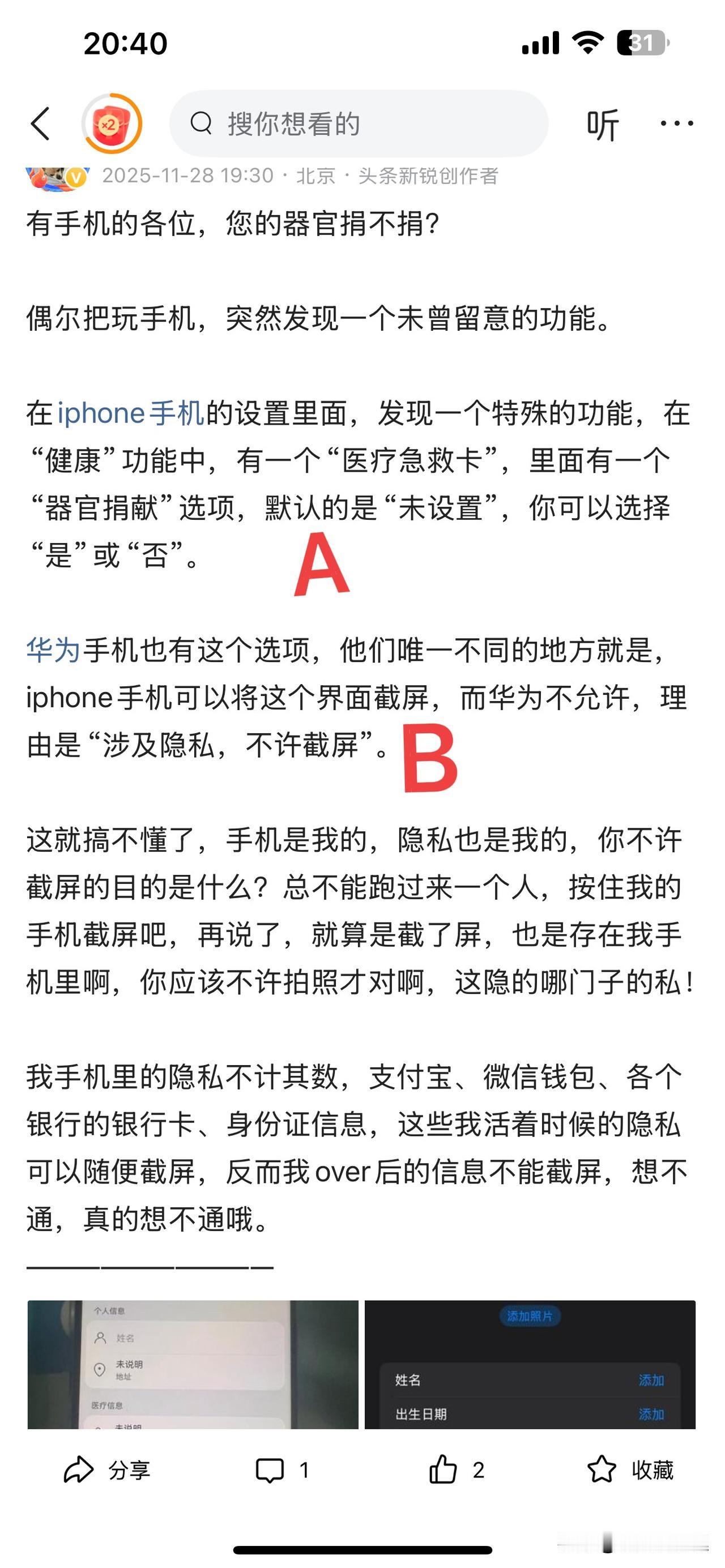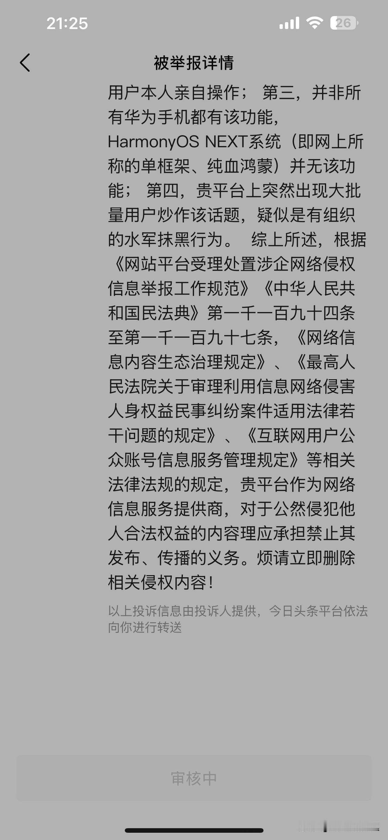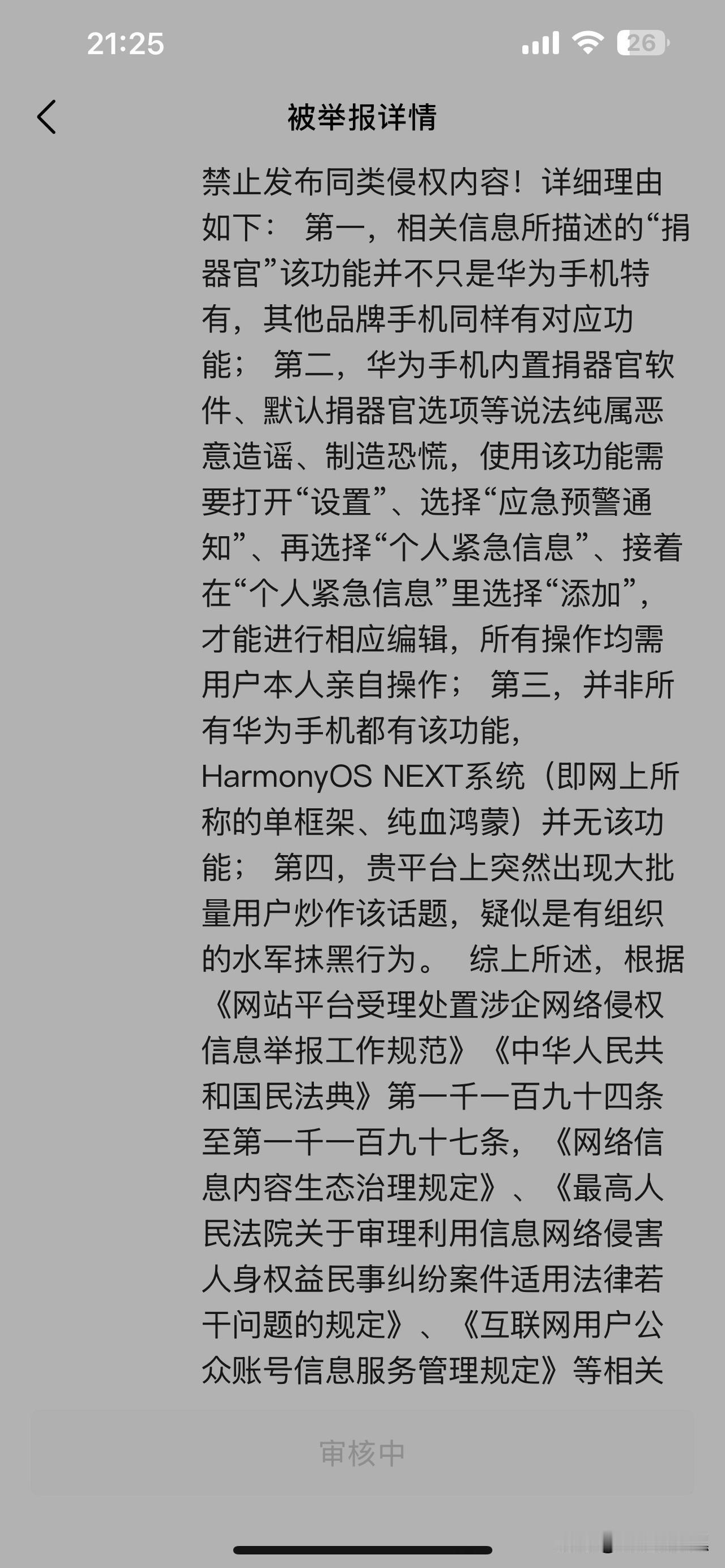 《华为终端有限公司》,本人针对贵公司污蔑损害本人合法名誉权益保留反诉的权利 今日,头条平台给本人发了一条系统通知,才知道,我被《华为终端有限公司》投诉了。 原来,今年11月28日本人的一篇微头条《有手机的各位,您的器官捐还是不捐》被华为污蔑为水军损害其公司名誉、商誉权。(本文原文请见图4) 仔细阅读了投诉内容,发现纯属无稽之谈。 华为投诉我归纳起来总共三条。 第一条,这个器官捐献的功能不仅华为有,其他品牌也有。我开篇宗义就讲了,首先iPhone手机就有,并非仅指你华为一家,根本不存在是污蔑。 第二条,华为认为他的功能是要进入“设置”后,经过本人操作才能设置。我在文章中也是遵照这个流程写的,见图4文章A段 第三条,华为称“并非华为所有手机都有该功能”,那么岂不是证明还是有部分手机有此功能吗!至于你华为是否所有手机都有,作为消费者,没有义务把你们所有款型都测试一遍。 本人在文中并非质疑污蔑华为此功能,而是质疑其为何不许截屏。见图4文章B段。 因为此功能涉及本人切身利益,无论本人主动设置“是”或“否”,都代表本人对自身器官处置的决定权,所以本人有权保留自己设置的记录,以留存凭证。而华为却不允许本人截屏保留,是否侵犯了本人的合法权益? 华为终端公司无视用户自身权益,反而污蔑本人为抹黑其公司的“水军”,这是对本人名誉权的严重侵害。 敦请华为终端有限公司,及时改正错误,尊重消费者合法的权益,如继续对本人合法权益进行侵害,本人保留对华为终端有限公司反诉的权利! ————————