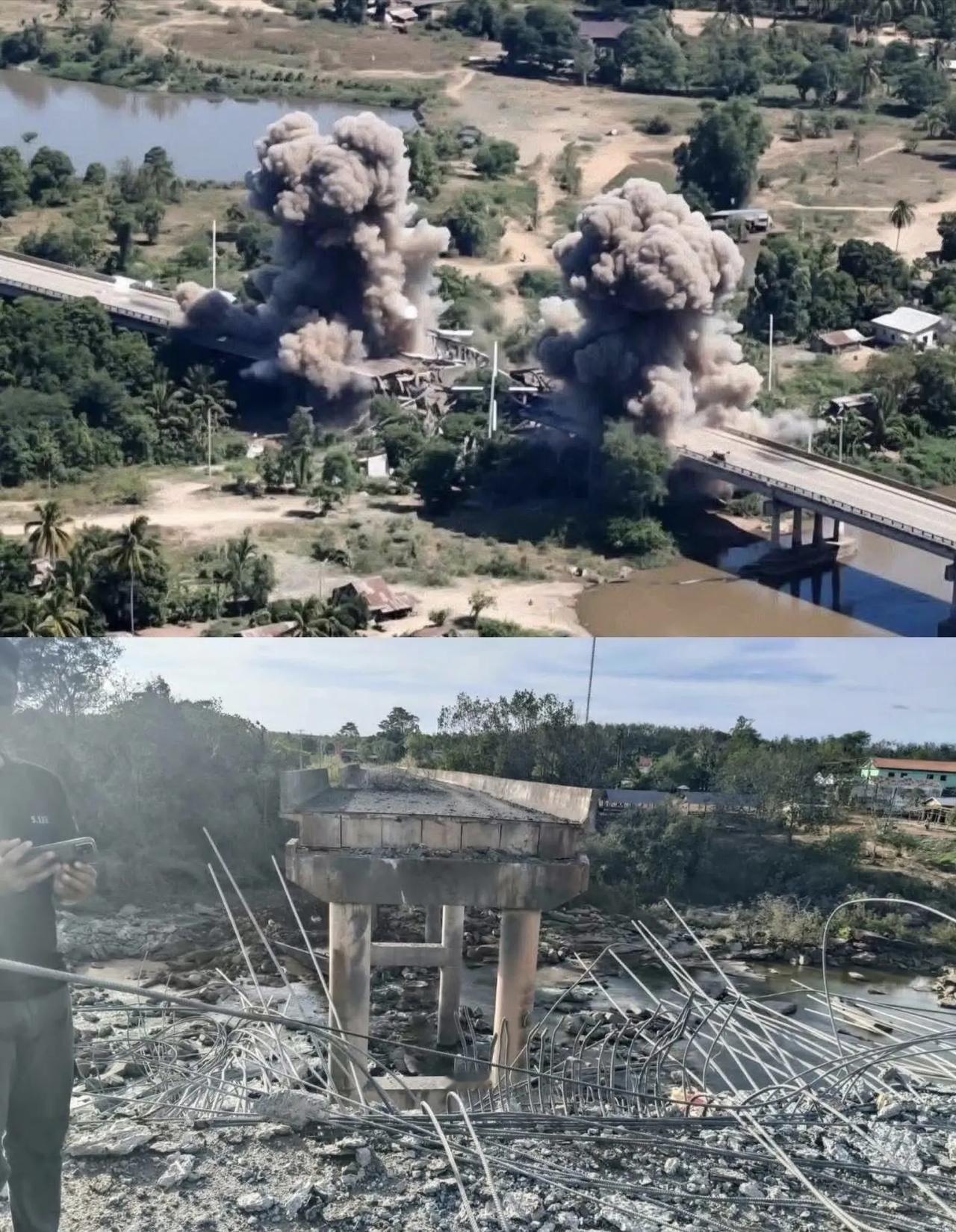柬埔寨普尔萨特省的梅特克大桥被泰国空军F-16战斗机投掷的炸弹炸断。通过这座大桥的柬军交通线算是废了,因为以柬埔寨的路桥建设和修复能力,是无力在短期内修复的。 这次柬泰冲突比数月前的冲突强度高、规模大,泰国军队所做的准备比较充分,战场上占据着比较明显的上风,所以泰国总理阿努廷态度很强硬,也不给美国总统老特面子。