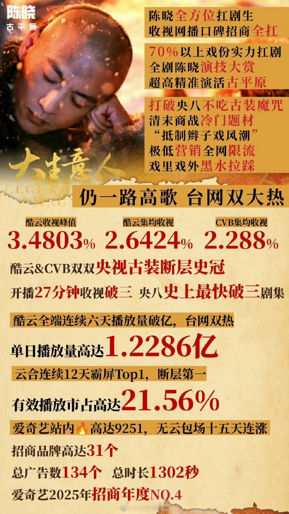 来看陈晓大生意人播到现在的实绩~收视网播招商口碑全网无短板,打破央八最快破三记录,拿下央视酷云cvb古装史冠,不分题材,不分赛道,陈晓剧粉盘稳稳发挥 很亮眼啦。