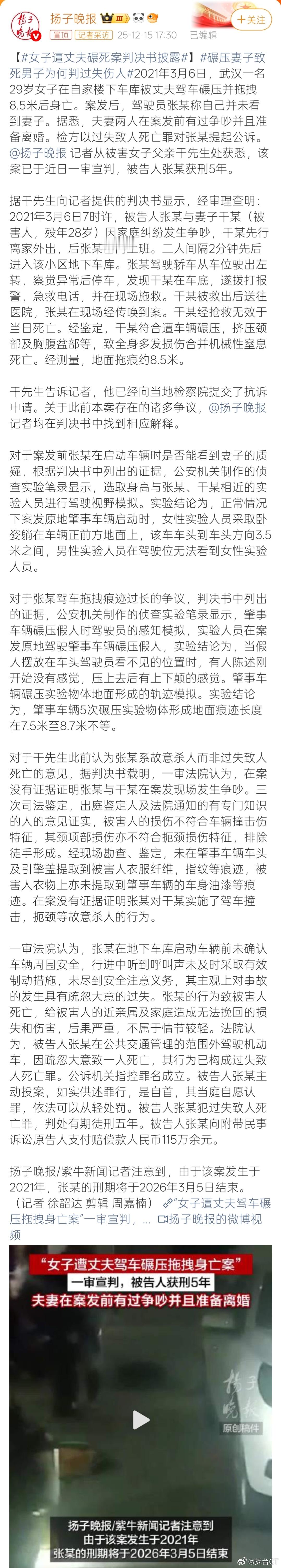 这案子,我之前在微博讲过,判的完全没问题。现如今,判决书披露,更加坚定了我当时的说法。综合判决书来看,这案子就是两人在家里吵架,女方先行出门,男方随后,前后间隔约2分钟。男方驾车左转时发现异常,停车后发现女方在车底,遂拨打电话报警,并拨打急救电话,在现场施救。原来,女方先行出门后躲在车底。男方完全没有料想到便驾车上班,最终惨案发生。于男方而言,他当然是有责任的。毕竟,启动车辆前未确认车辆周围安全,行进过程中听到呼叫也没有及时停车,主观上存在明显的疏忽大意。据此获刑5年,已经是罪行适当。女子遭丈夫碾死案判决书披露实务案例看一看