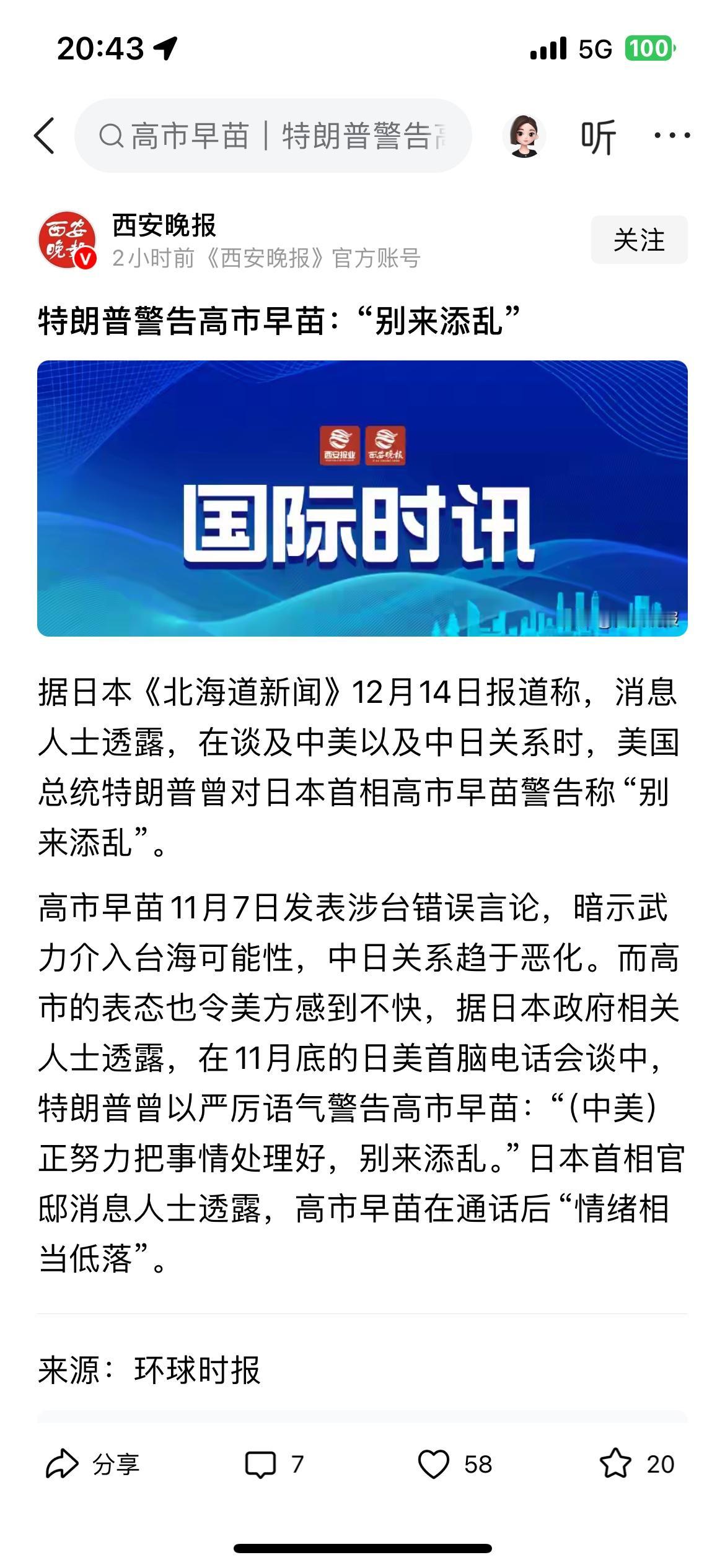 高市早苗的添乱那是有人拿她当枪使!结果现在特朗普转头批评警告高市两句、唱一下“红脸”,特朗普的里子、面子就有了! 在谈及中美及中日关系时,特朗普即使这样警告高市早苗“别来添乱”。 特朗普的警告对高市早苗有什么打击力度没有,其实是啥力度都没有。高市早苗的乱已经添了!而且是不思悔改、拒绝撤回错误言论!特朗普的警告也只能用呵呵了。