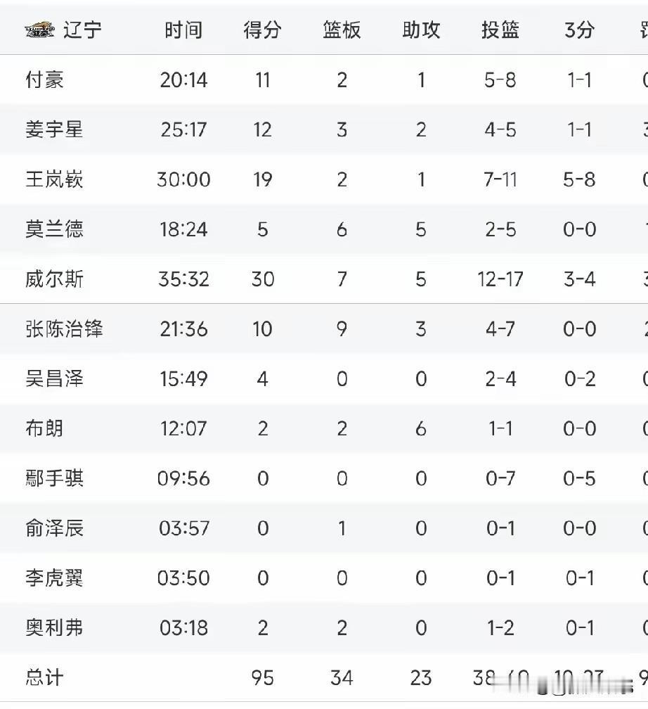 辽宁大胜广厦球员评分 威尔斯 10分 张陈志峰 10分 王岚钦 10分 姜宇星 10分 莫兰德 9分 付 豪 9分 吴昌泽 9分 鄢守琦 9分 布朗 8分 余泽晨 8分 奥利弗 7.5分 李虎翼 7.5分
