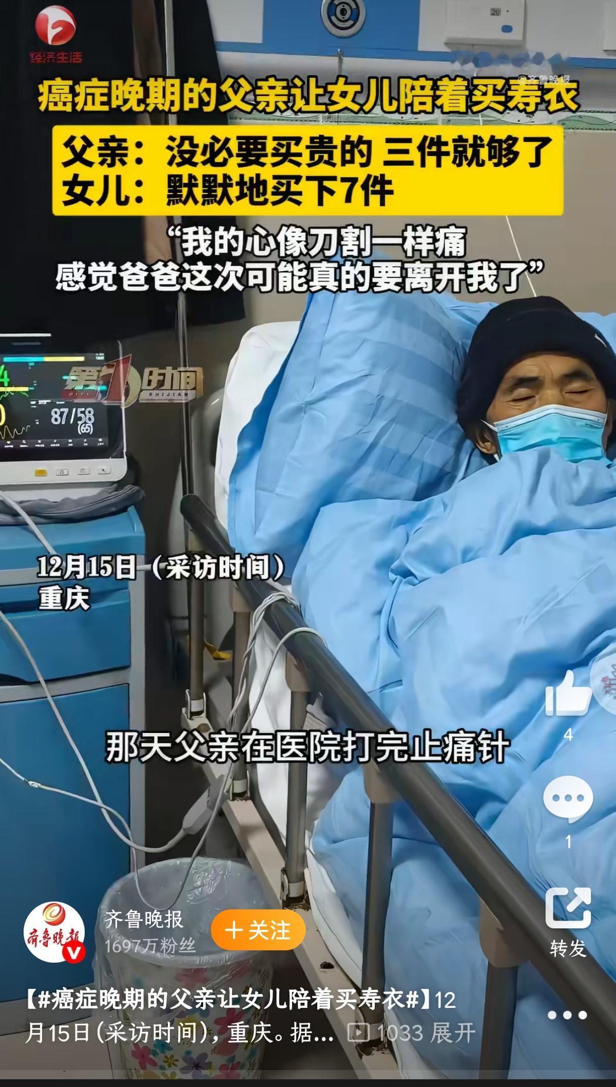 “不必买贵,三件足够”是父亲对女儿的体谅,坚持购置了七件寿衣是女儿对父亲的不舍。 最痛苦的事就是看着亲人即将离世却无能为力,只能攥着那点微不足道的心意,想把所有的周全都堆到他身上。 父亲说“不必买贵,三件足够”,是怕给女儿添负担,藏着一辈子的体贴;女儿坚持购置七件寿衣,是舍不得让他走得将就,揣着满心的眷恋。 那些多出来的衣裳,哪里是布料,分明是没说够的话、没尽完的孝,是往后漫长岁月里,一想起就红了眼眶的念想。