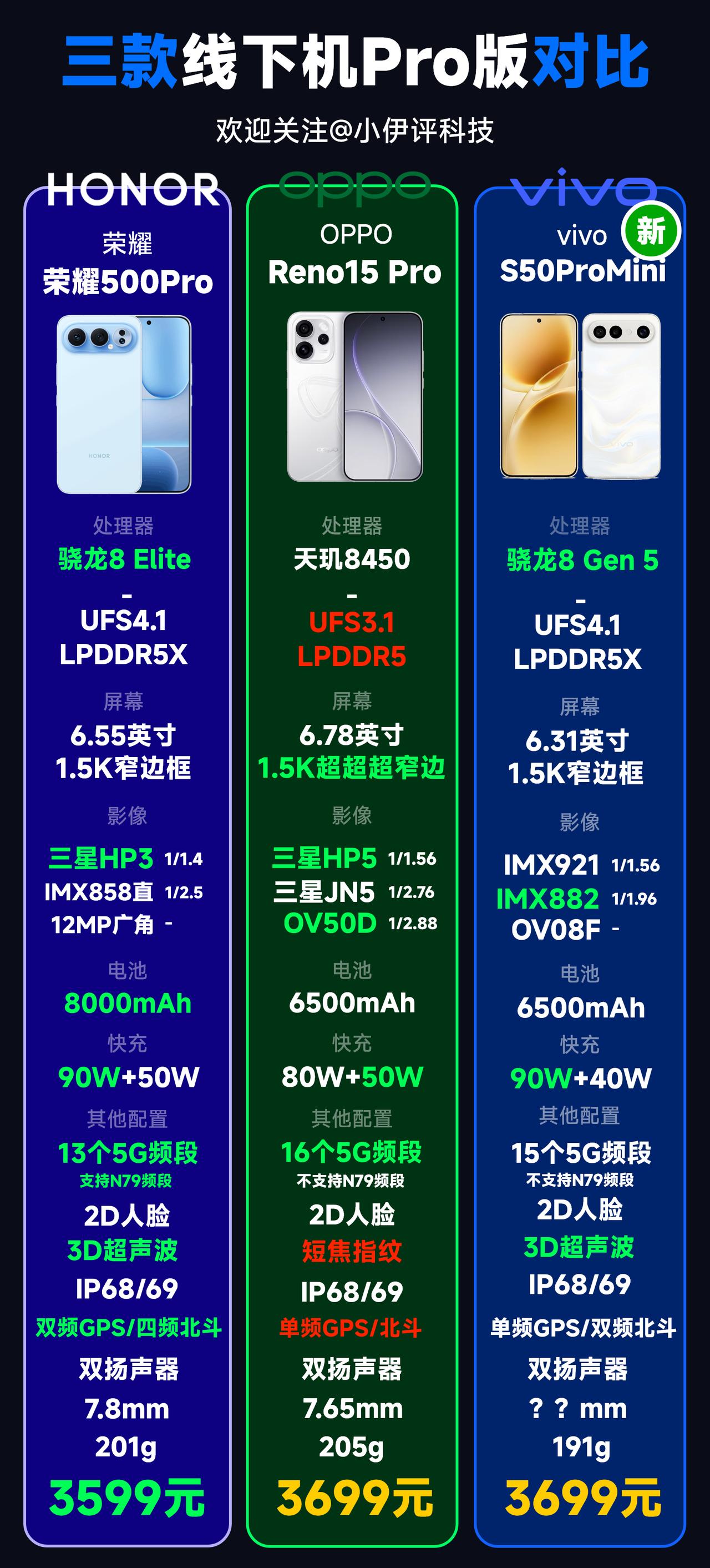 三款线下机对比,vivo S50,OPPO Reno 15以及荣耀500系列详细配置对比,整体来说,还得是荣耀500系列啊,这配置和价格竟然是最有性价比,这你敢信吗?而且这8000毫安时电池可真是太香了,无脑冲吧,荣耀这波杀死比赛了属实是...