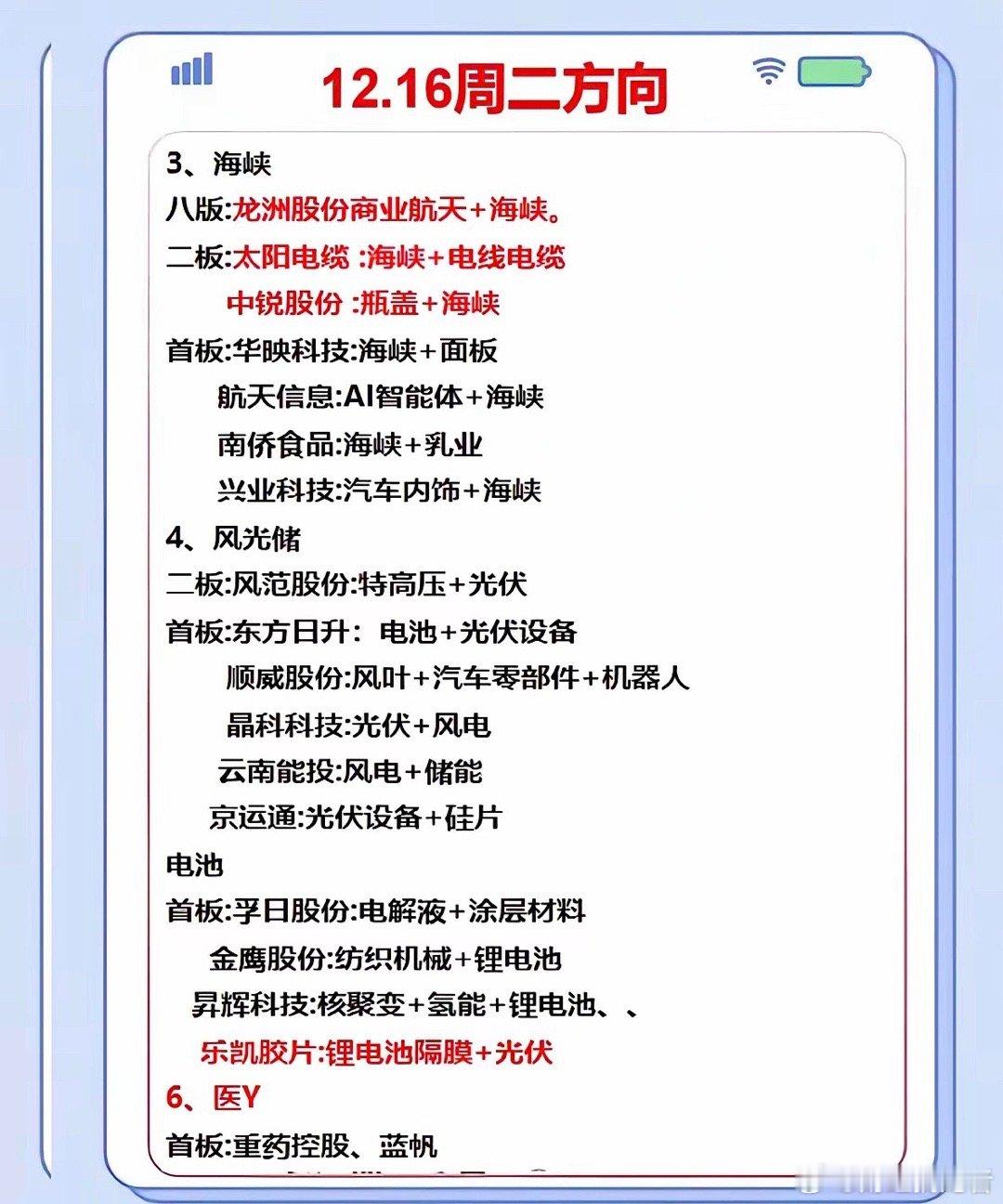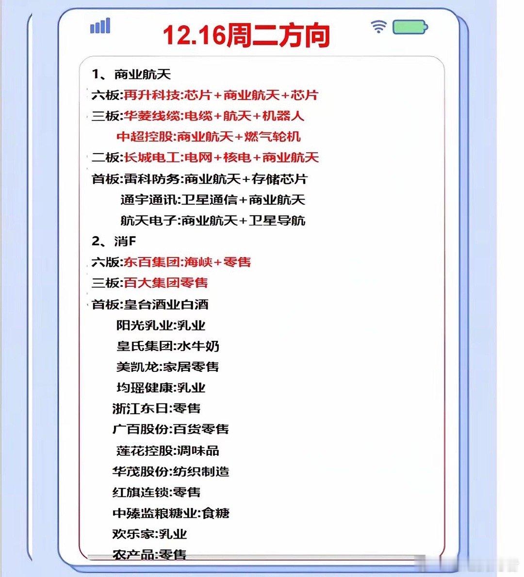 12月16日(周二)A股市场热点方向及投资逻辑1. 商业航天:作为当前市场绝对核心主线,政策与产业双重催化下,技术突破与商业化落地进程加速,叠加产业链上下游配套需求释放,相关标的兼具题材弹性与长期成长逻辑。2. 大消费(百货零售):消费复苏预期升温,线下消费场景持续修复,叠加部分标的存在资产运作、合作拓展等资本层面催化,成为市场首板资金青睐的补涨分支。3. 航天电缆:深度绑定商业航天赛道,特种线缆产品适配航天装备的高可靠性需求,属于细分领域核心配套环节,直接受益于航天产业订单放量。4. 风光储、芯片:风光储赛道受益于新能源装机需求稳定增长,叠加技术迭代降本增效;芯片板块则依托国产替代大趋势,在政策扶持与下游需求拉动下,具备长期配置价值。5. 核聚变、机器人:属于前沿科技题材,核聚变技术突破预期持续发酵,机器人赛道则受益于智能制造升级与政策支持,二者均具备较强的题材想象空间。今日看盘上证指数a股