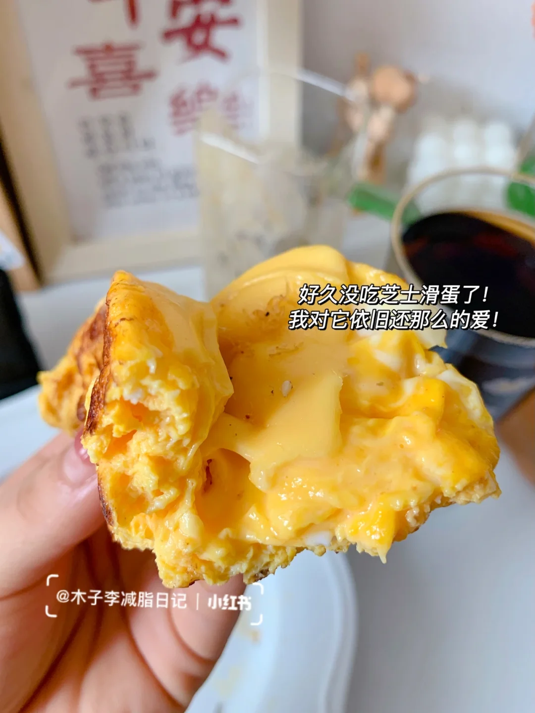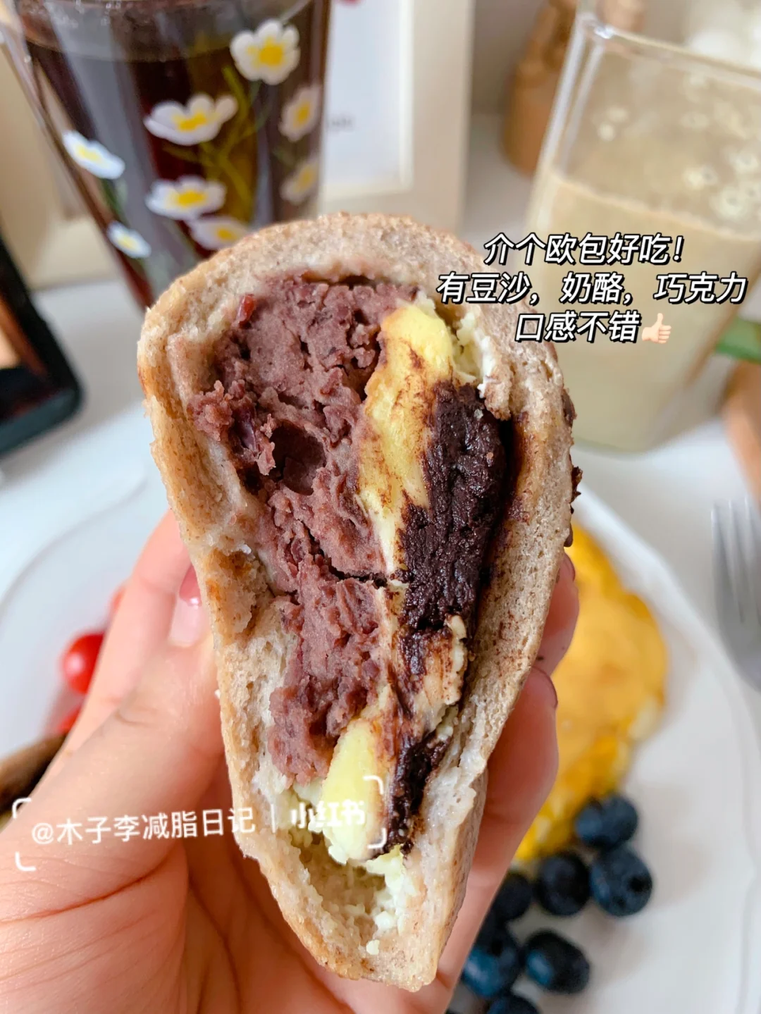 🍳早餐:冷萃咖啡➕豆沙奶酪巧克力欧包➕千禧果➕芝士滑蛋➕蓝莓➕奶昔