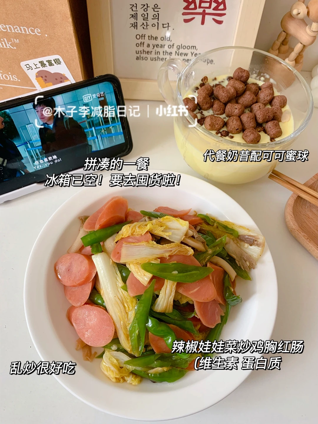🥙午餐:奶昔➕可可蜜球➕辣椒蔬菜炒红肠