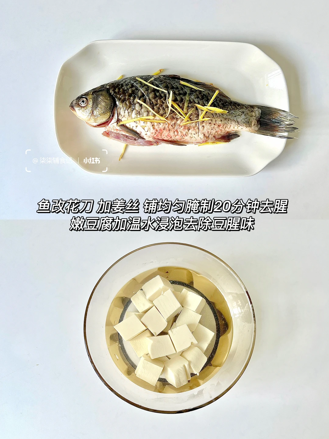 ▫️鲫鱼改花刀,用姜丝里里外外铺均匀腌制20分钟去腥,豆腐加温水浸泡去除豆腥味