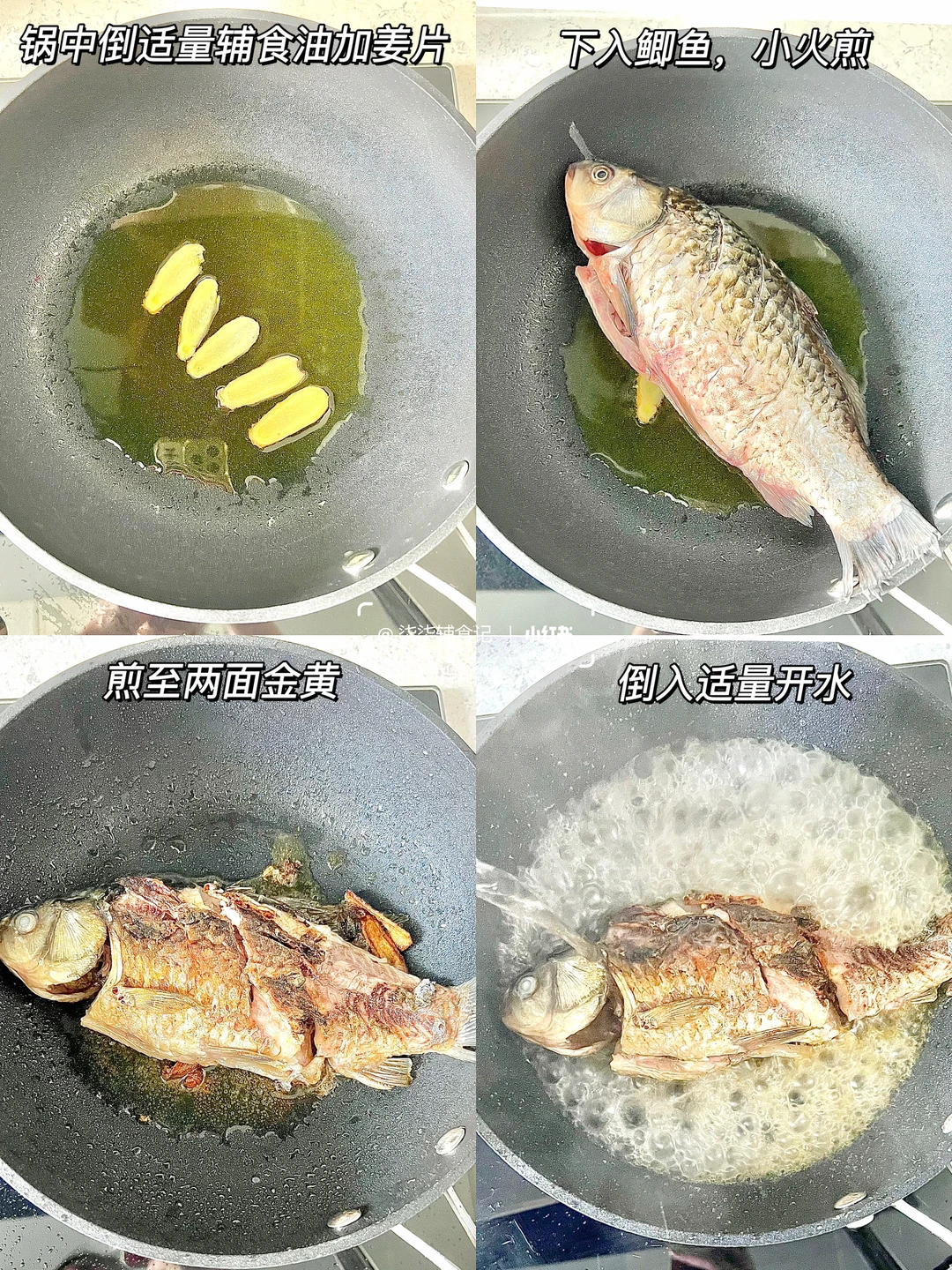 ▫️锅中倒入辅食油,放几片姜片,油热下入鲫鱼煎至两面金黄,倒入适量开水