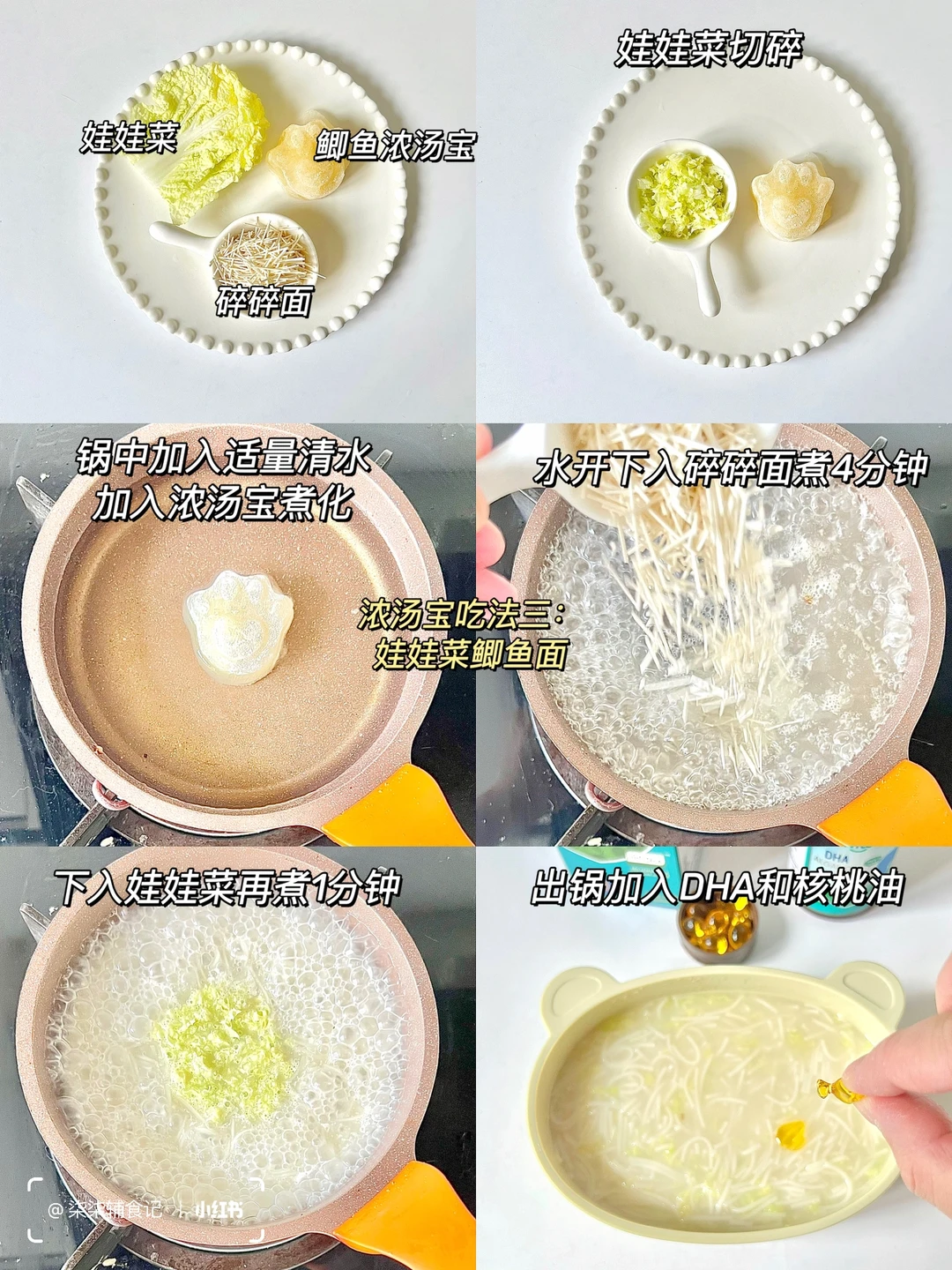 ▫️锅中烧水,水开放入浓汤宝,再次煮开下入面条,煮熟加入宝宝喜欢吃的青菜即可。