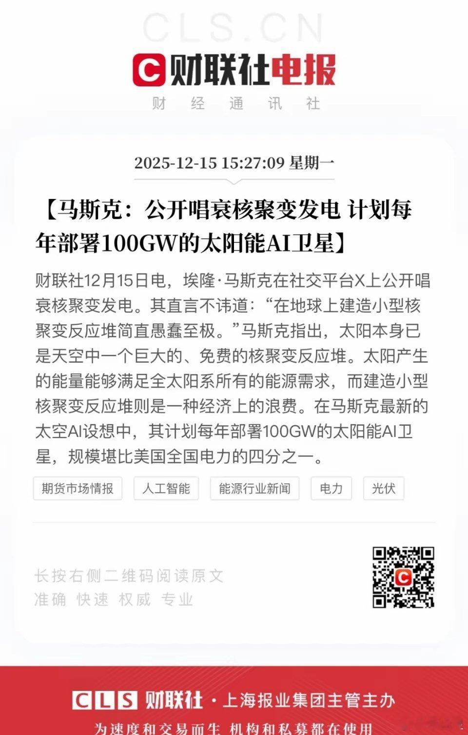 马斯克唱衰可控核聚变?!可控核聚变近期的强势会被动摇吗?马斯克表示目前太阳就是最大的核聚变,利用好太阳能就好。并表示每年部署100GW的太阳能Ai卫星,太阳能的利好来的猝不及防!这难道就是东方日升和固德威莫名大涨的原因?太阳能发电离不开储能,是不是这个组合拳可以开打了,反正大A科技总是跟着美股走。特斯拉储能今年是增长最快业务之一,感觉马斯克在打一套组合拳,一个新的叙事逻辑呼之欲出,既包括了商业航天、太空数据中心,也包括光伏储能系统新电网构想!